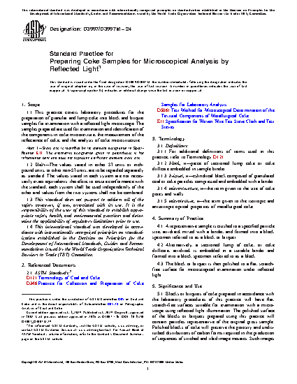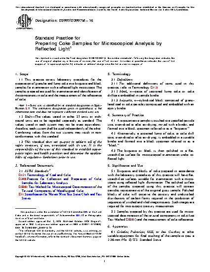 1.1 This practice covers laboratory procedures for the preparation of granular and lump coke into briquette and block samples for examination with a reflected light microscope. The samples prepared are used for examination and identification of the components in coke and the measurement of the reflectance of coke.