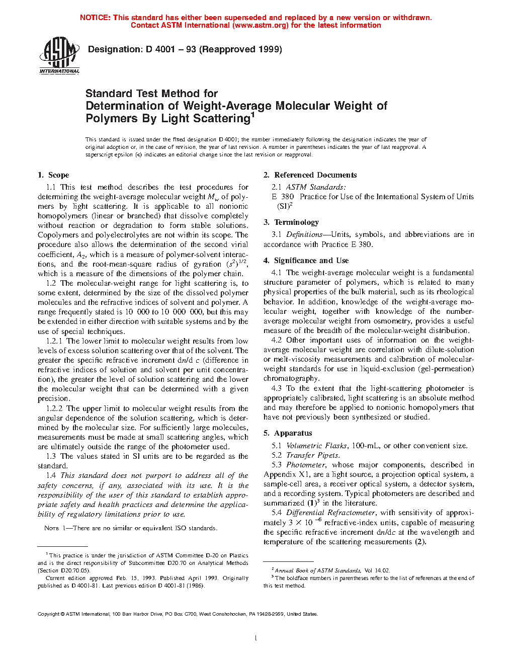 1.2 The molecular-weight range for light scattering is, to some extent, determined by the size of the dissolved polymer molecules and the refractive indices of solvent and polymer. A range frequently stated is 10,000 to 10,000,000, but this may be extended in either direction with suitable systems and by the use of special techniques.