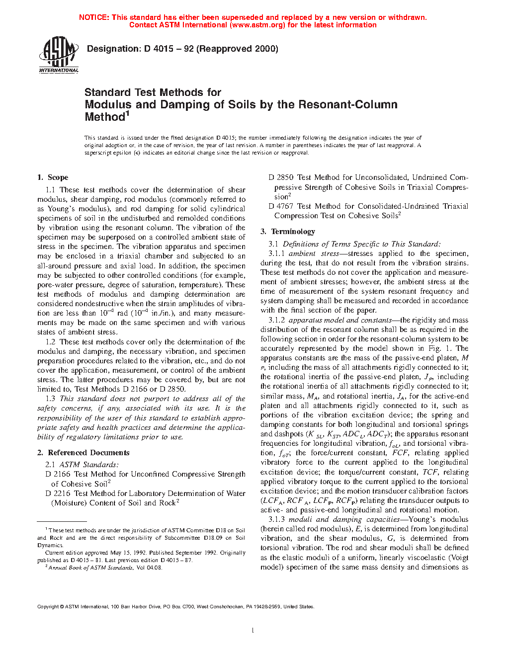 1.3 These test methods are limited to the determination of the shear modulus and shear damping, the necessary vibration, and specimen preparation procedures related to the vibration, etc., and do not cover the application, measurement, or control of the axial and lateral static normal stresses. The latter procedures may be covered by, but are not limited to, Test Method D2850, D4767, or D7181.