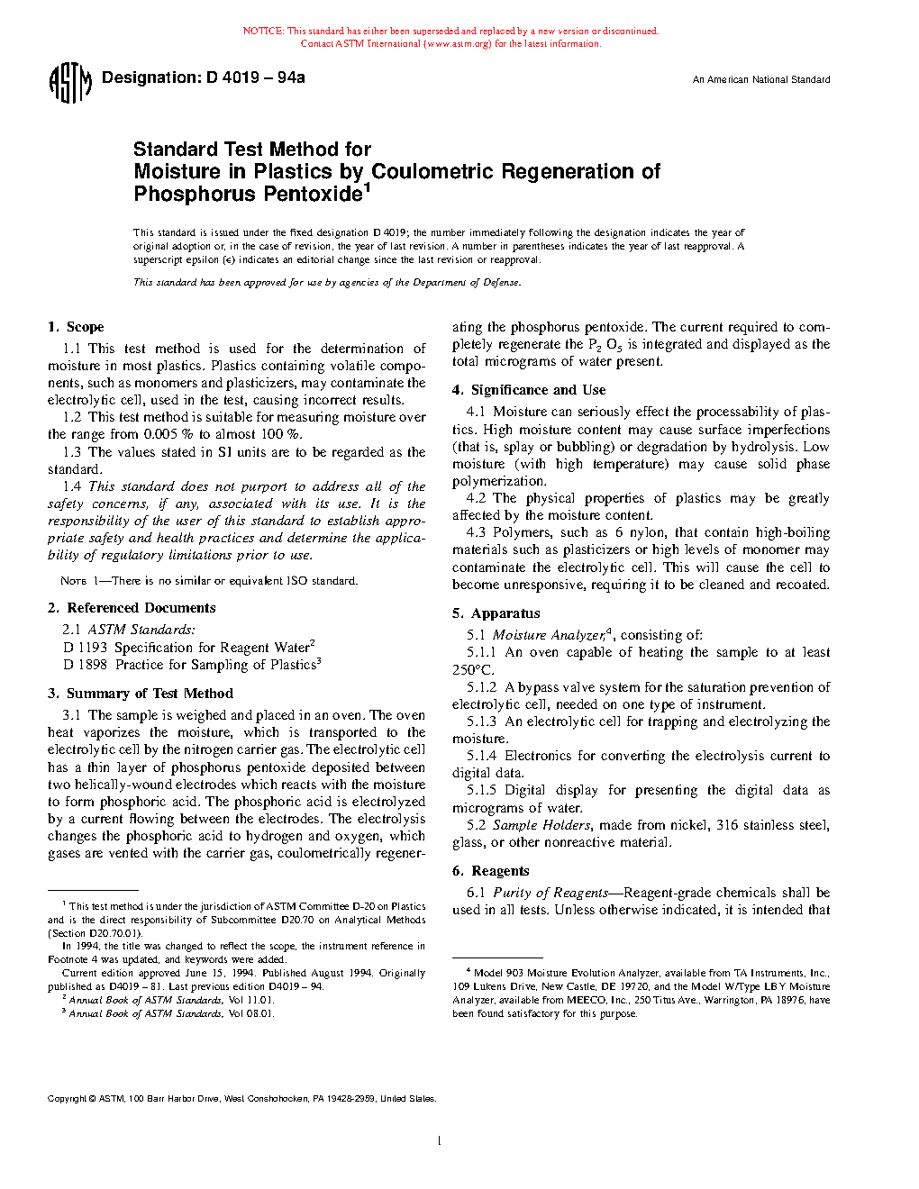 Standard Test Method for Moisture in Plastics by Coulometric Regeneration of Phosphorus Pentoxide (Withdrawn 2002)