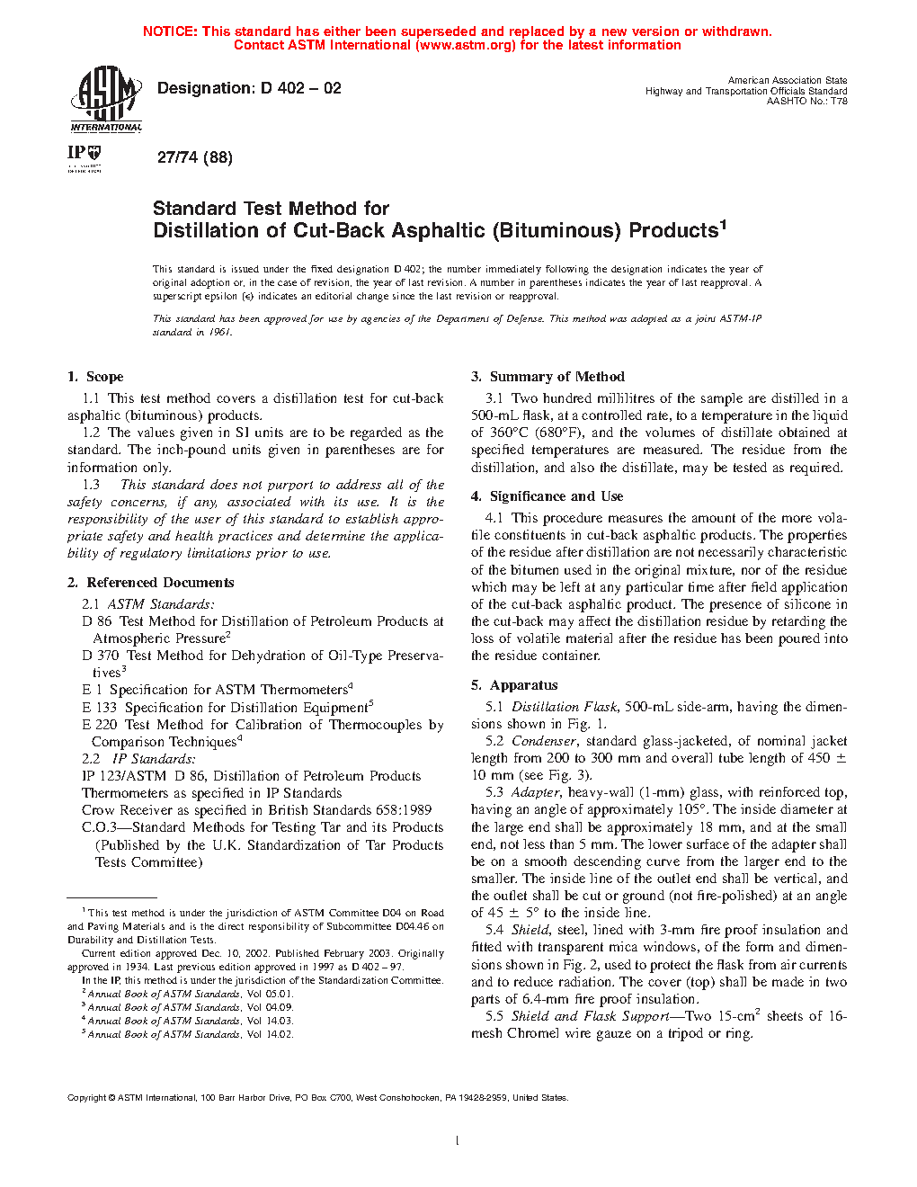 This procedure measures the amount of the more volatile constituents in cutback asphaltic products. The properties of the residue after distillation are not necessarily characteristic of the bitumen used in the original mixture, nor of the residue which may be left at any particular time after field application of the cutback asphaltic product. The presence of silicone in the cutback may affect the distillation residue by retarding the loss of volatile material after the residue has been poured into the residue container.
