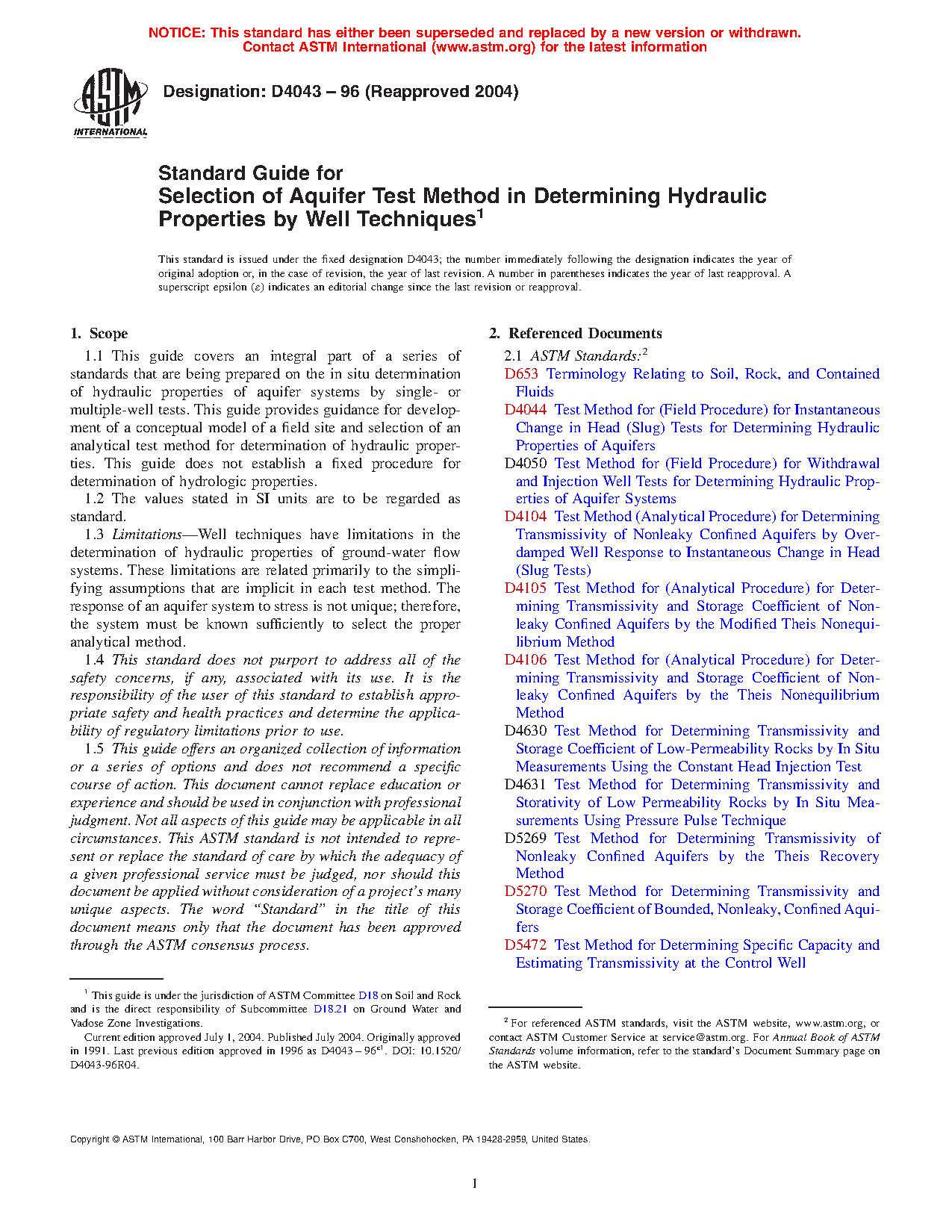 1.3 Limitations—Well techniques have limitations in the determination of hydraulic properties of groundwater flow systems. These limitations are related primarily to the simplifying assumptions that are implicit in each test method. The response of an aquifer system to stress is not unique; therefore, the system must be known sufficiently to select the proper analytical method.