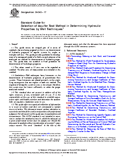 1.1 This guide covers an integral part of a series of standards that are being prepared on the in situ determination of hydraulic properties of aquifer systems by single- or multiple-well tests. This guide provides guidance for development of a conceptual model of a field site and selection of an analytical test method for determination of hydraulic properties. This guide does not establish a fixed procedure for determination of hydrologic properties.