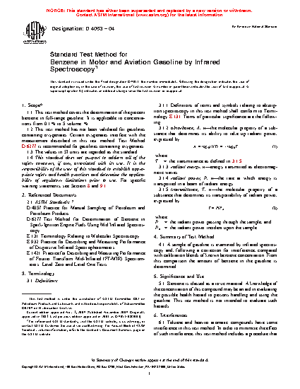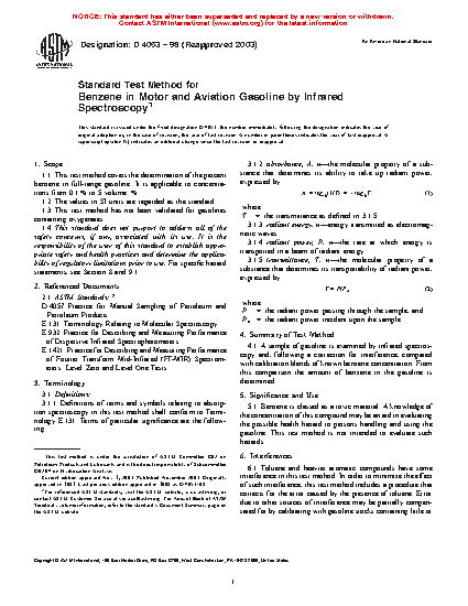 1.1 This test method covers the determination of the percent benzene in full-range gasoline. It is applicable to concentrations from 0.1% to 5 volume %.
