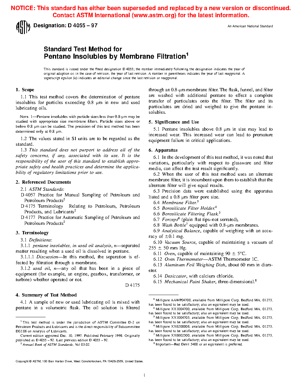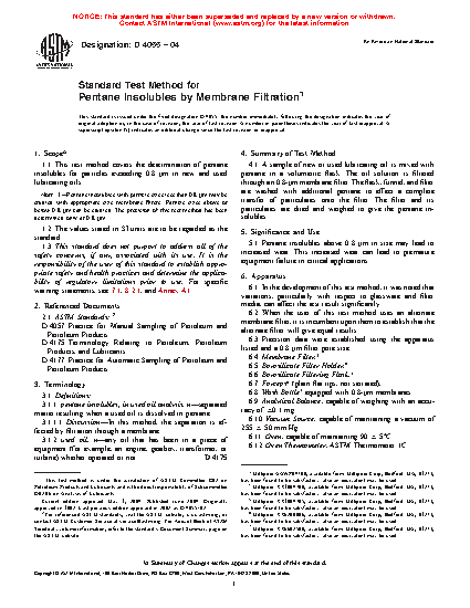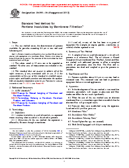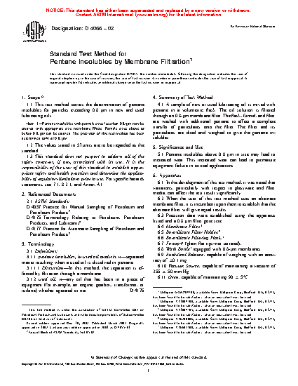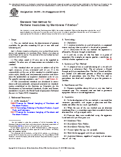1.1 This test method covers the determination of pentane insolubles for particles exceeding 0.8 μm in new and used lubricating oils.