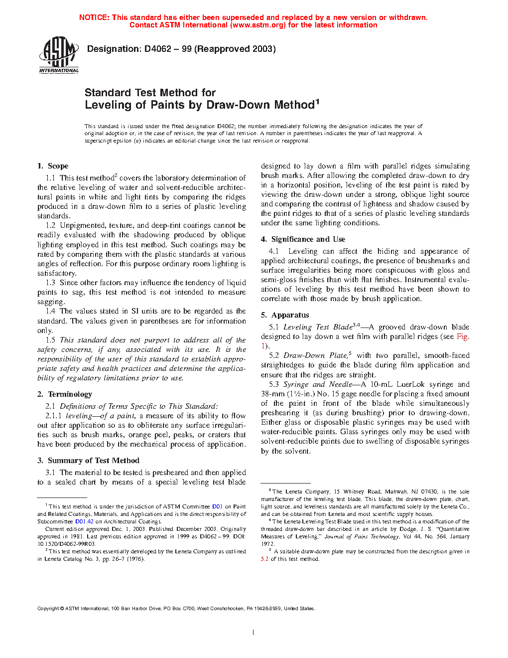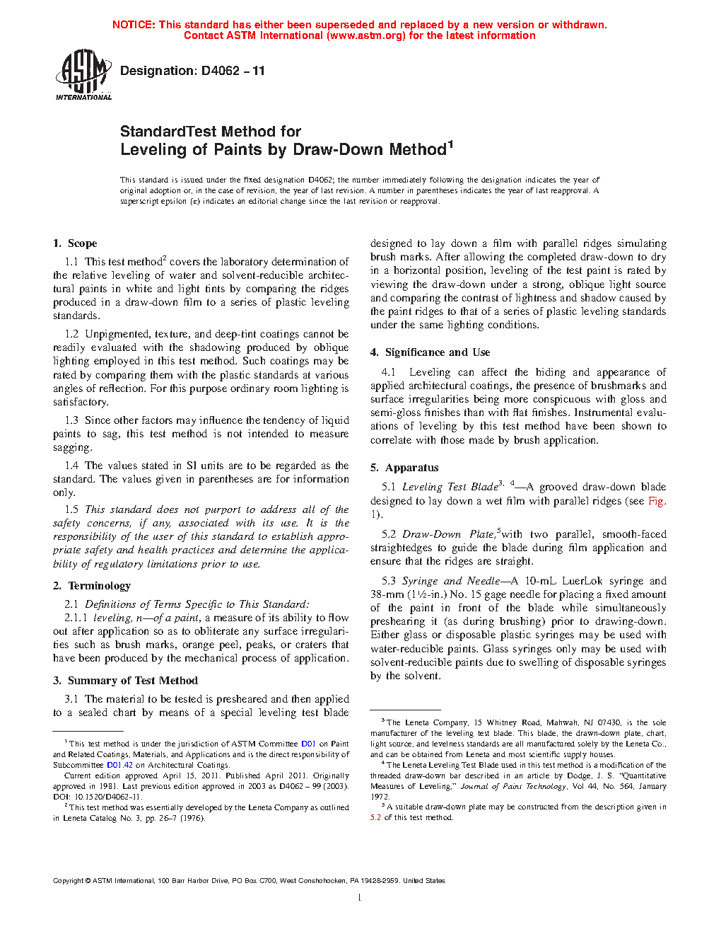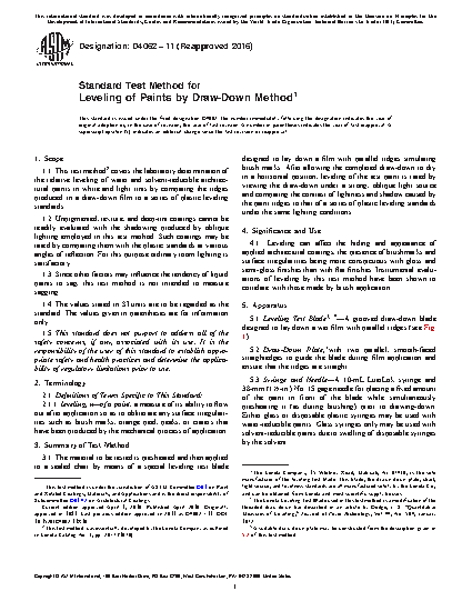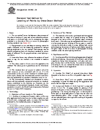 1.1 This test method covers the laboratory determination of the relative leveling of water and solvent-reducible architectural paints in white and light tints by comparing the ridges produced in a draw-down film to a series of plastic leveling standards.