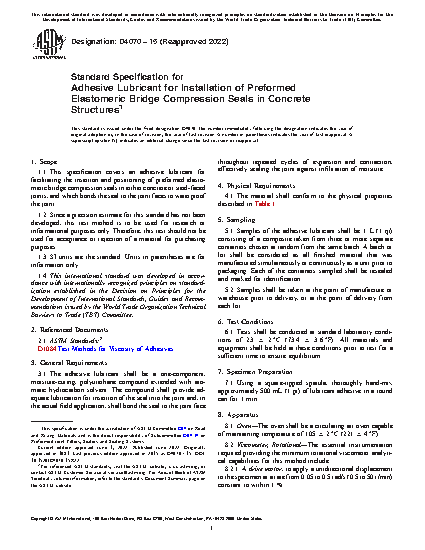 1.1 This specification covers an adhesive lubricant for facilitating the insertion and positioning of preformed elastomeric bridge compression seals in either concrete or steel-faced joints, and which bonds the seal to the joint faces to waterproof the joint.