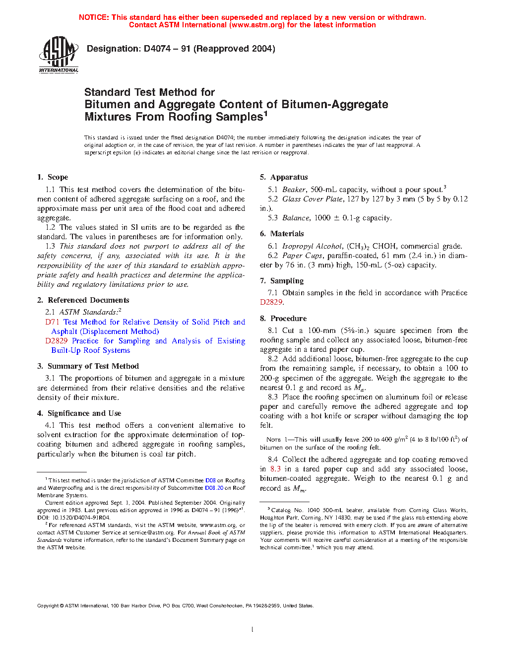 1.1 This test method covers the determination of the bitumen content of adhered aggregate surfacing on a roof, and the approximate mass per unit area of the flood coat and adhered aggregate.