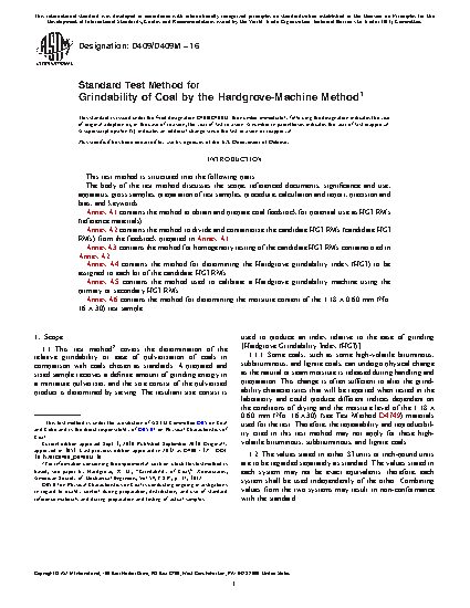 1.1 This test method2 covers the determination of the relative grindability or ease of pulverization of coals in comparison with coals chosen as standards. A prepared and sized sample receives a definite amount of grinding energy in a miniature pulverizer, and the size consist of the pulverized product is determined by sieving. The resultant size consist is used to produce an index relative to the ease of grinding [Hardgrove Grindability Index (HGI)].