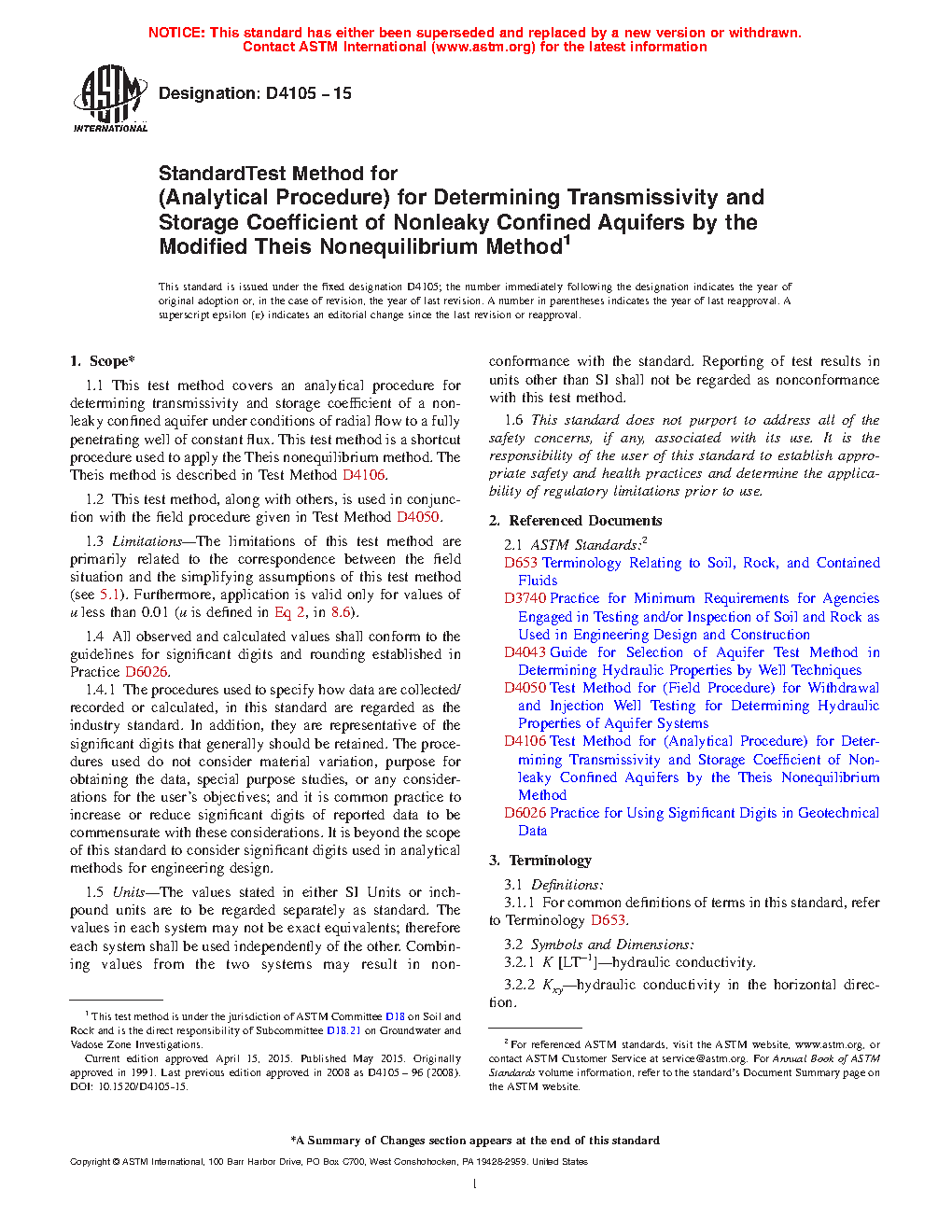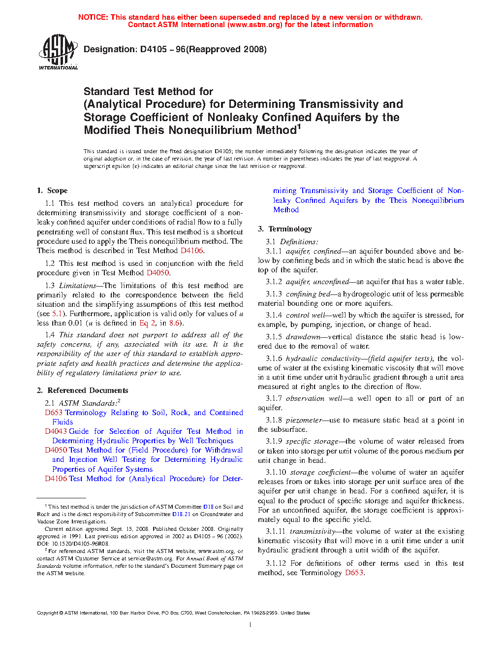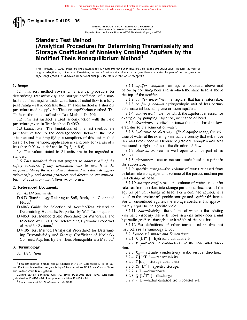 1.1 This test method covers an analytical procedure for determining transmissivity and storage coefficient of a nonleaky confined aquifer under conditions of radial flow to a fully penetrating well of constant flux. This test method is a shortcut procedure used to apply the Theis nonequilibrium method. The Theis method is described in Test Method D4106.