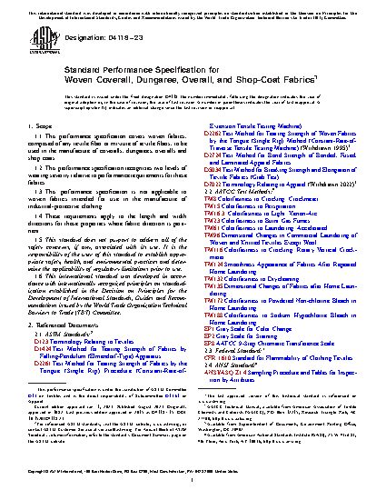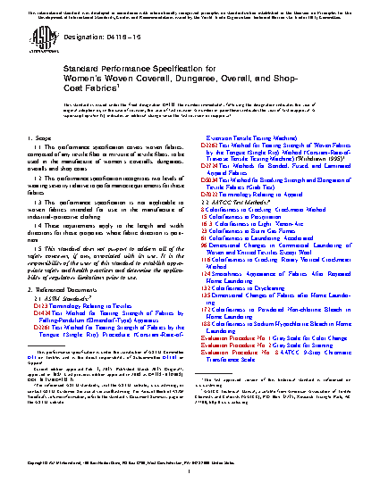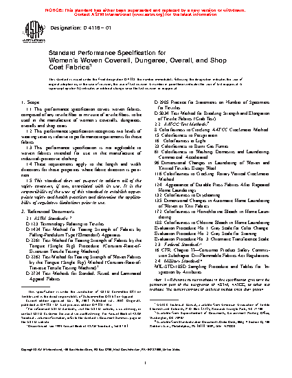 1.1 This performance specification covers woven fabrics, composed of any textile fiber or mixture of textile fibers, to be used in the manufacture of women's coveralls, dungarees, overalls and shop coats.