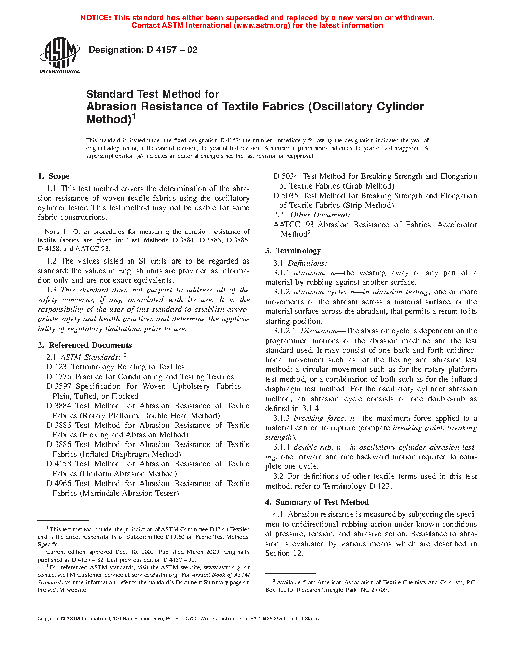 Note 1: Other procedures for measuring the abrasion resistance of textile fabrics are given in: Guides D3884 and D4158, and Test Methods D3885, D3886, and AATCC 93.