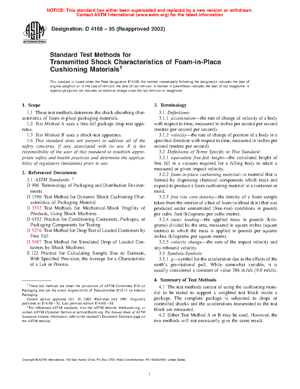 5.2 These methods, in contrast to other methods that usually test only the cushioning foam, are designed to evaluate foam-in-place cushioning materials in a manner in which the foam-in-place packaging material is used. In particular, the method includes simultaneous use of a plastic film, the foam, and the box usually used in this method of packaging. See Fig. 1.