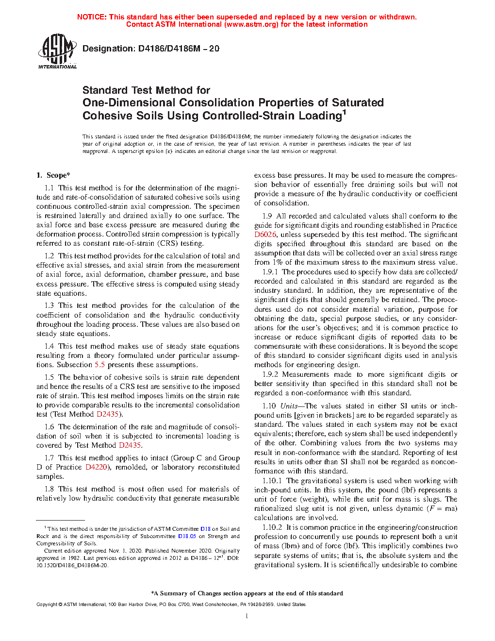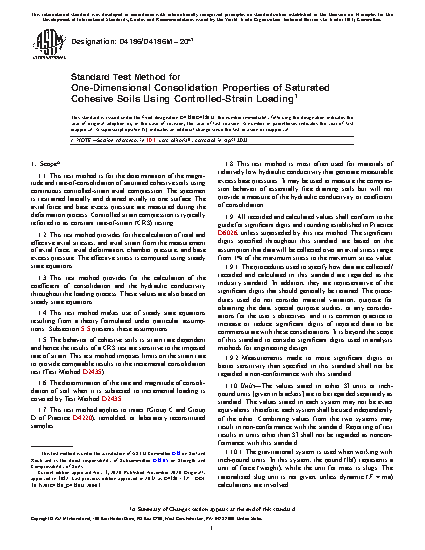 1.1 This test method is for the determination of the magnitude and rate-of-consolidation of saturated cohesive soils using continuous controlled-strain axial compression. The specimen is restrained laterally and drained axially to one surface. The axial force and base excess pressure are measured during the deformation process. Controlled strain compression is typically referred to as constant rate-of-strain (CRS) testing.