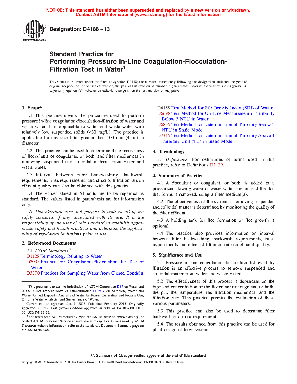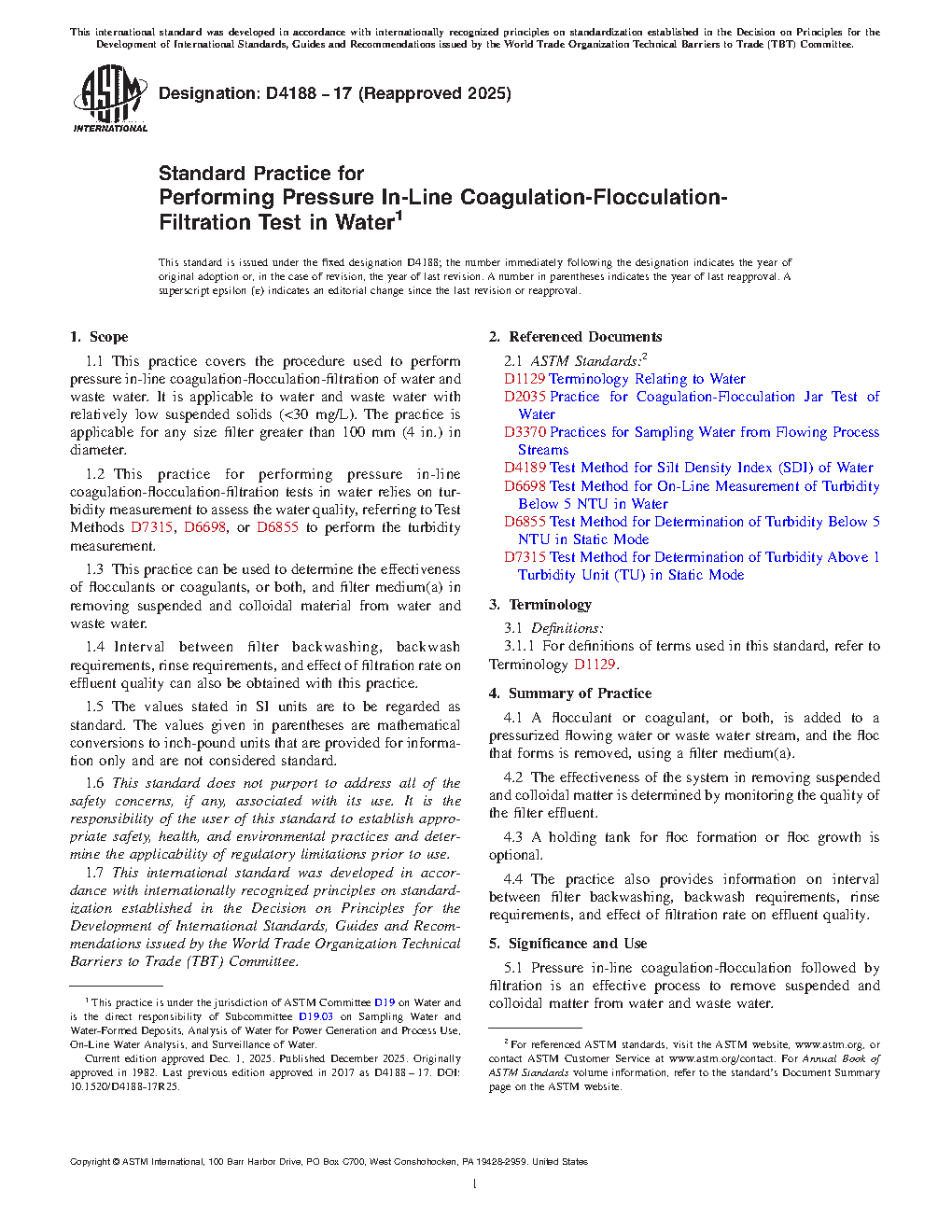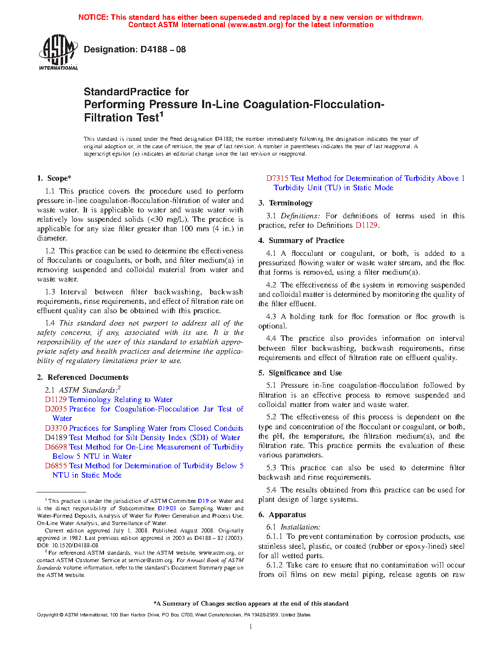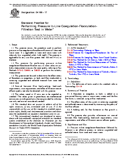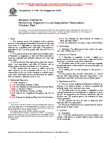 1.1 This practice covers the procedure used to perform pressure in-line coagulation-flocculation-filtration of water and waste water. It is applicable to water and waste water with relatively low suspended solids (<30 mg/L). The practice is applicable for any size filter greater than 100 mm (4 in.) in diameter.