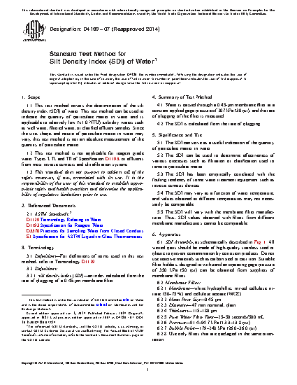 1.1 This test method covers the determination of the silt density index (SDI) of water. This test method can be used to indicate the quantity of particulate matter in water and is applicable to relatively low (1.0 NTU) turbidity waters such as well water, filtered water, or clarified effluent samples. Since the size, shape, and nature of particulate matter in water may vary, this test method is not an absolute measurement of the quantity of particulate matter.