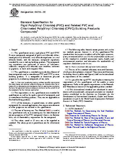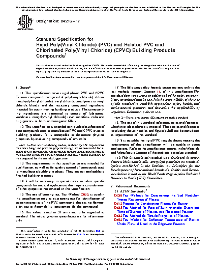 1.1 This specification covers rigid plastic PVC and CPVC Exterior compounds composed of poly(vinyl chloride), chlorinated poly(vinyl chloride), vinyl chloride copolymers or vinyl chloride blends, and the necessary compound ingredients intended for use in making building products. The compounding ingredients are permitted to consist of lubricants, stabilizers, nonpoly(vinyl chloride) resin modifiers, colorants or pigments, or both, and inorganic fillers.