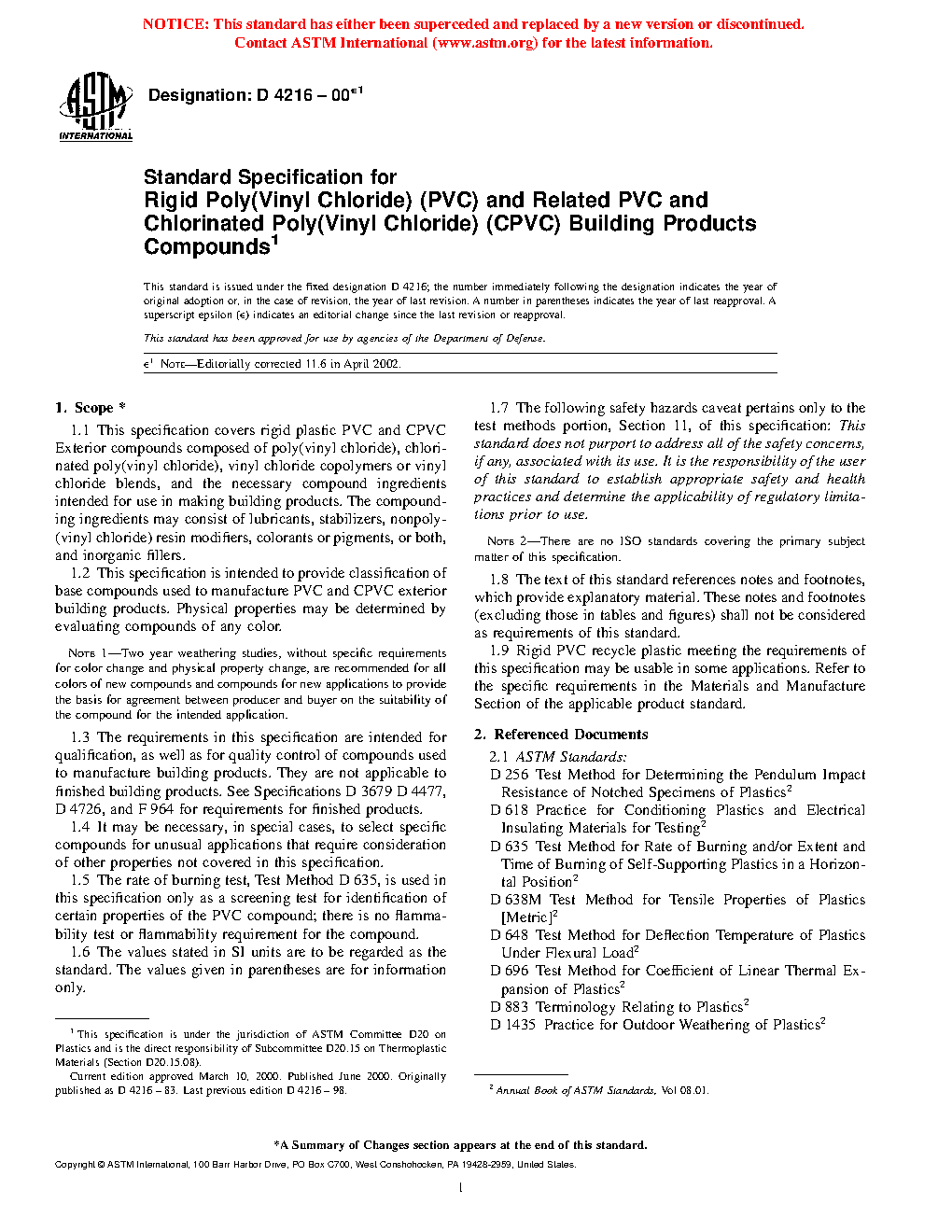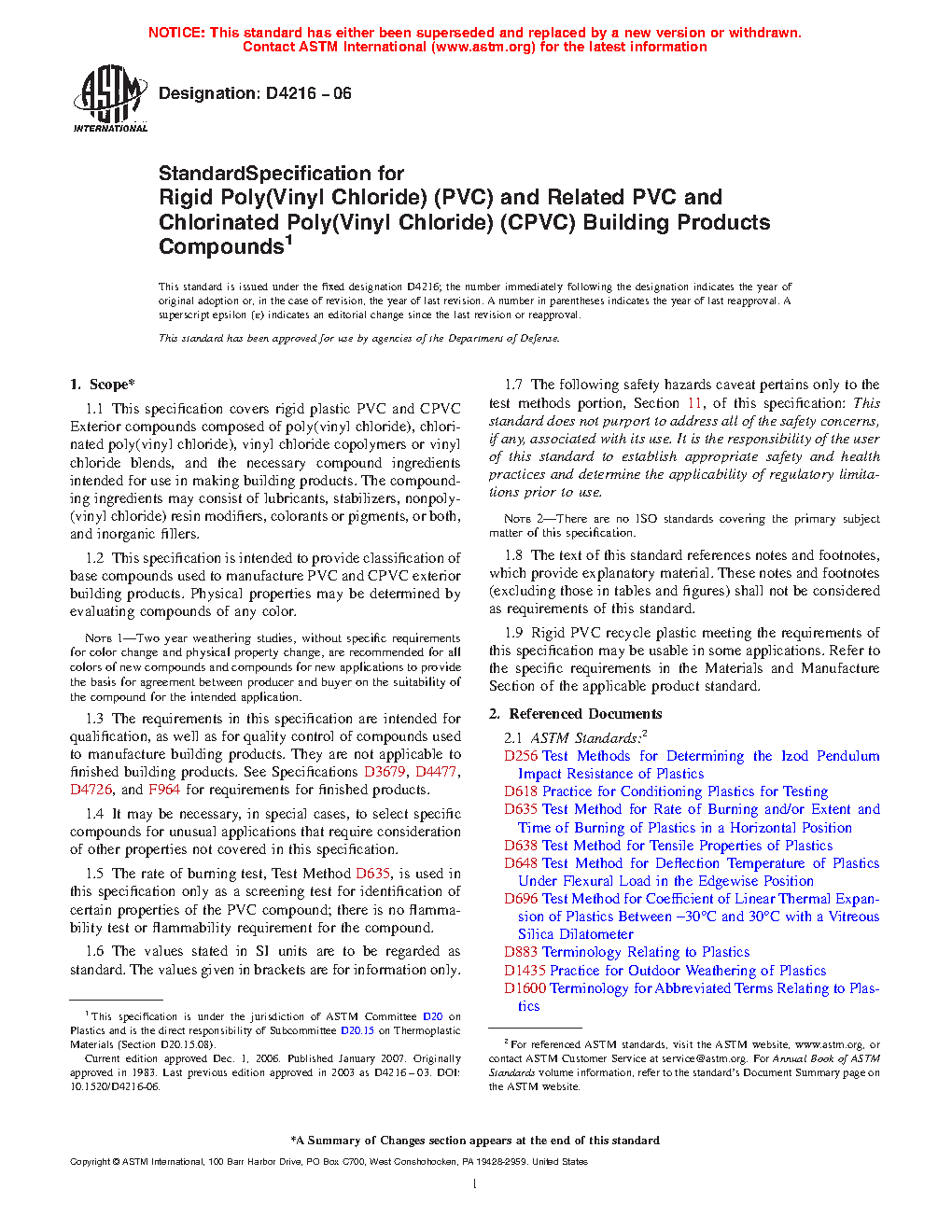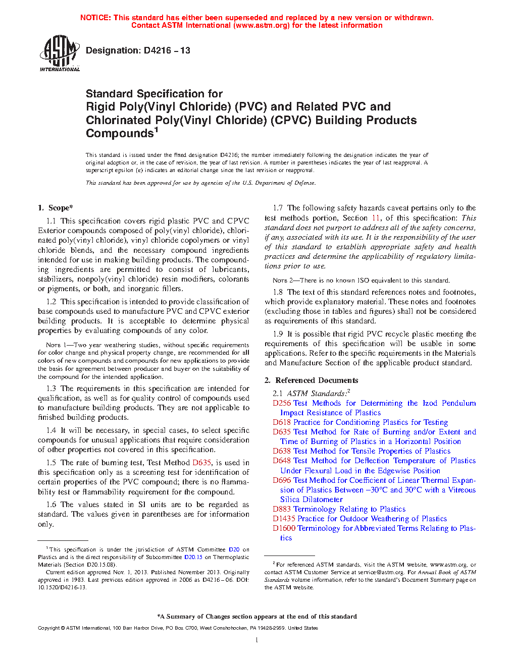 1.2 This specification is intended to provide classification of base compounds used to manufacture PVC and CPVC exterior building products. It is acceptable to determine physical properties by evaluating compounds of any color.