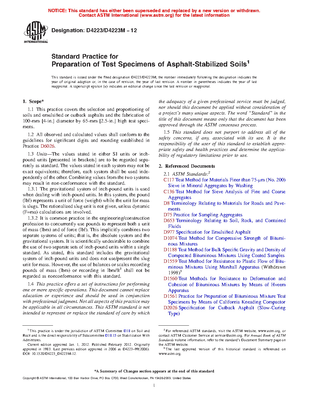 1.1 This standard covers the selection and proportioning of soils and emulsified or cutback asphalts and the fabrication of 100-mm [4-in.] diameter by 65-mm [2.5-in.] high test specimens.