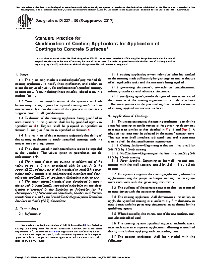 1.1 This practice provides a standard qualifying method for coating applicators to verify their proficiency and ability to attain the required quality for application of specified coatings to concrete surfaces including those in safety-related areas in a nuclear facility.