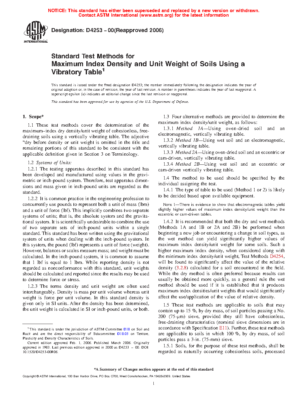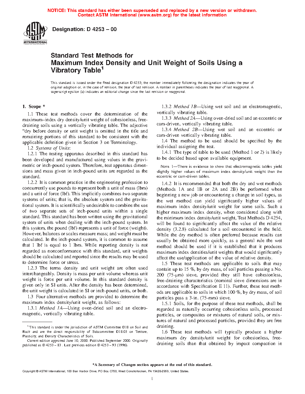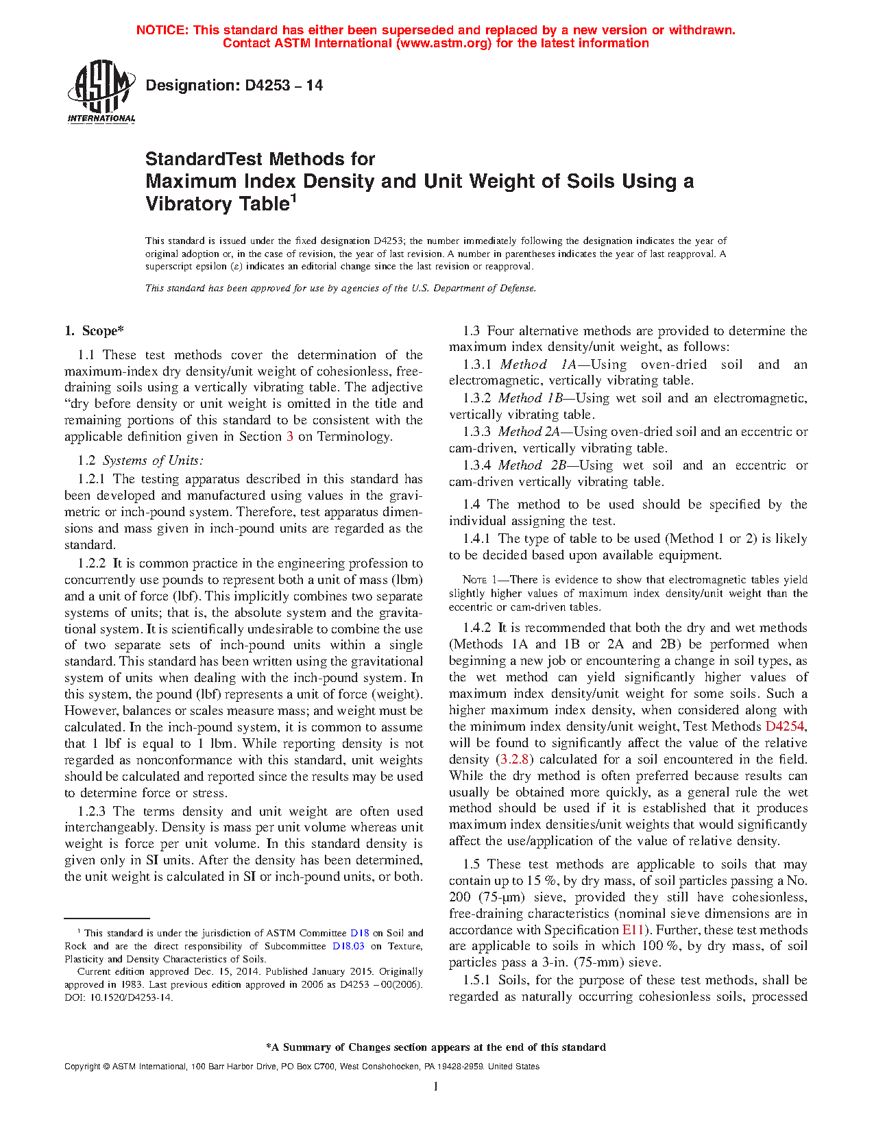 1.3 Four alternative methods are provided to determine the maximum index density/unit weight, as follows: