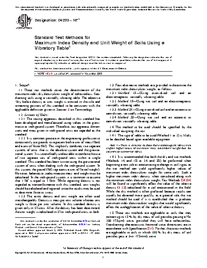 1.1 These test methods cover the determination of the maximum-index dry density/unit weight of cohesionless, free-draining soils using a vertically vibrating table. The adjective “dry before density or unit weight is omitted in the title and remaining portions of this standard to be consistent with the applicable definition given in Section 3 on Terminology.