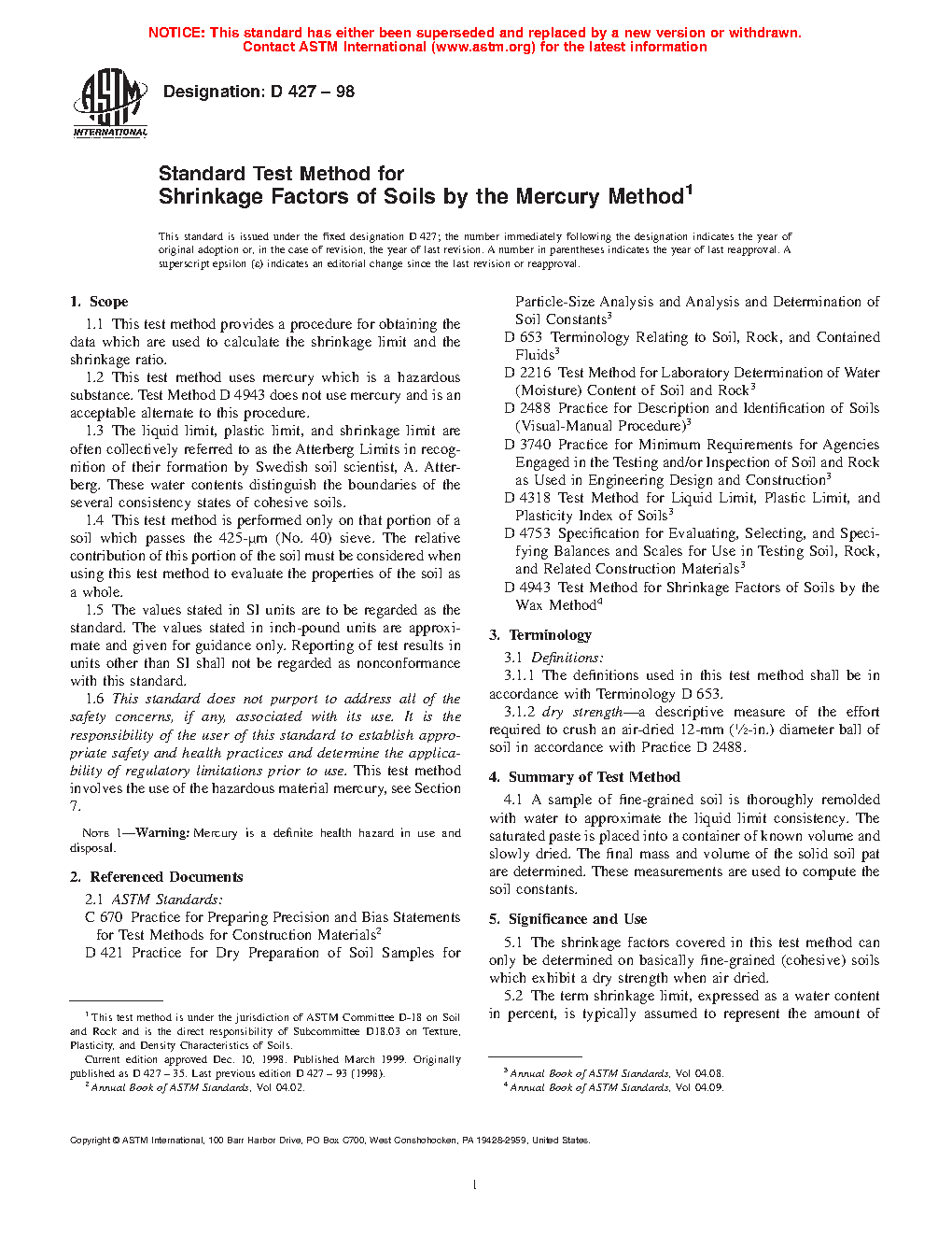 1.7 This standard does not purport to address all of the safety concerns, if any, associated with its use. It is the responsibility of the user of this standard to establish appropriate safety and health practices and determine the applicability of regulatory limitations prior to use. This test method involves the use of the hazardous material mercury (Warning-mercury is a definite health hazard in use and disposal), see Section 7.