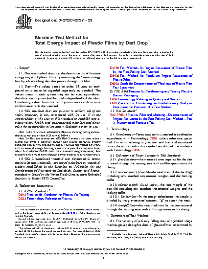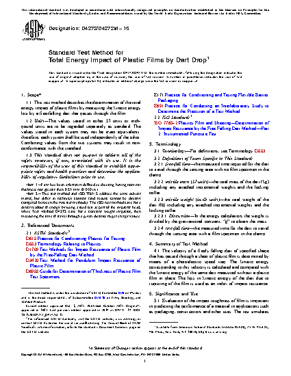 1.1 This test method describes the determination of the total energy impact of plastic films by measuring the kinetic energy lost by a free-falling dart that passes through the film.