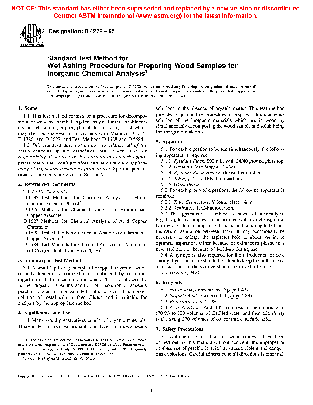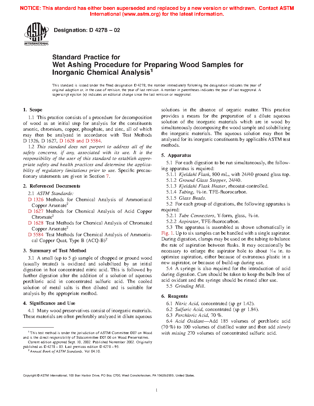 1.1 This test method consists of a procedure for decomposition of wood as an initial step for analysis for the constituents arsenic, chromium, copper, phosphate, and zinc, all of which may then be analyzed according to Methods:D1033; D1035; D1326; D1627; and Test Methods D1628.