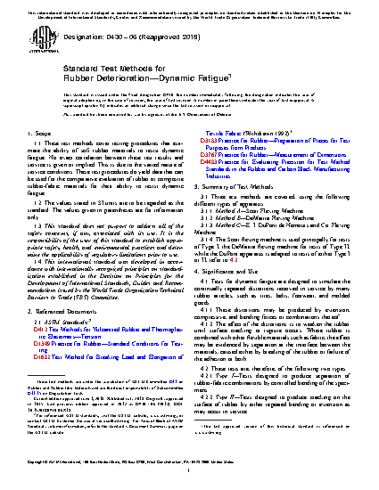 1.1 These test methods cover testing procedures that estimate the ability of soft rubber materials to resist dynamic fatigue. No exact correlation between these test results and service is given or implied. This is due to the varied nature of service conditions. These test procedures do yield data that can be used for the comparative evaluation of rubber or composite rubber-fabric materials for their ability to resist dynamic fatigue.