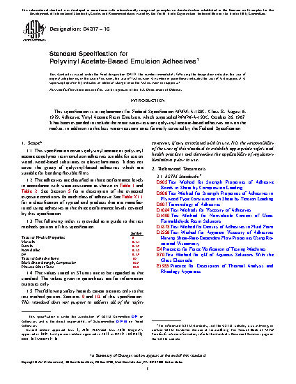 This specification covers polyvinyl acetate or polyvinyl acetate copolymer resin emulsion adhesives suitable for use on wood, wood-based substrates, or plastic laminates. This does not cover the group of polyvinyl-based adhesives suitable for bonding flexible films. Adhesives are classified on the basis of water resistance at three performance levels, namely wet-use (Type 1), intermediate use (Type 2), and dry-use (Type 3). Adhesives shall conform to test requirements as performed under the following exposure conditions and treatments: dry shear at specified temperatures; two-cycle boil; 48-hour soak; humidity exposure; freeze-thaw stability; and storage life. Materials shall also adhere to physical properties such as density, nonvolatile matter, and pH.