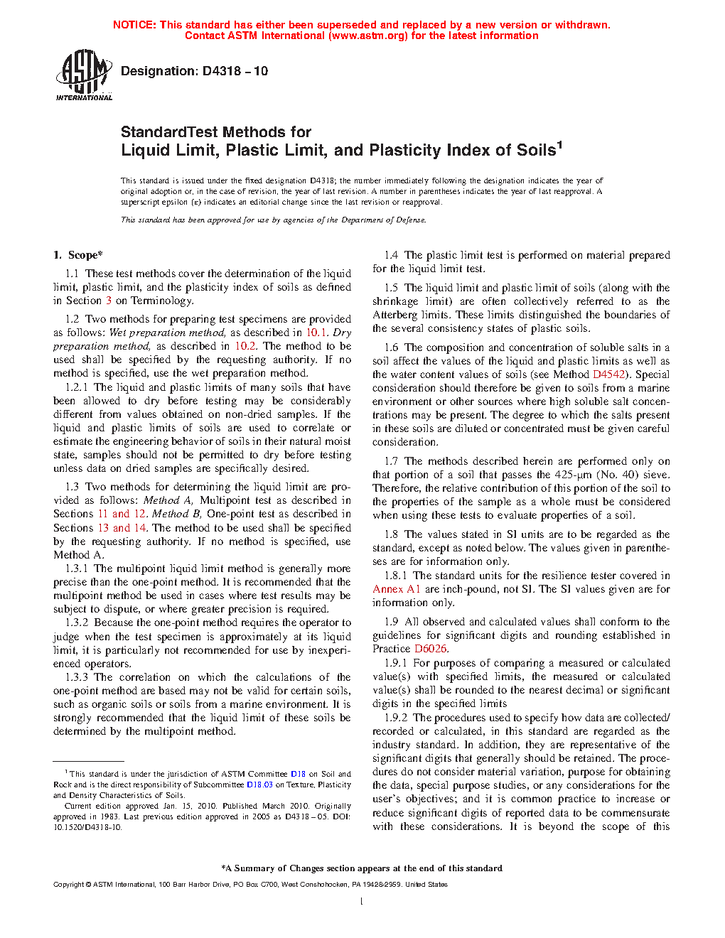 1.1 These test methods cover the determination of the liquid limit, plastic limit, and the plasticity index of soils as defined in Section 3 on Terminology.
