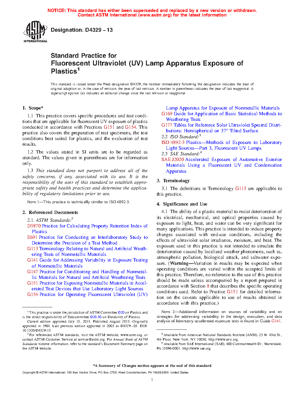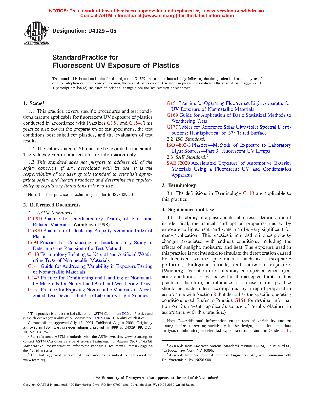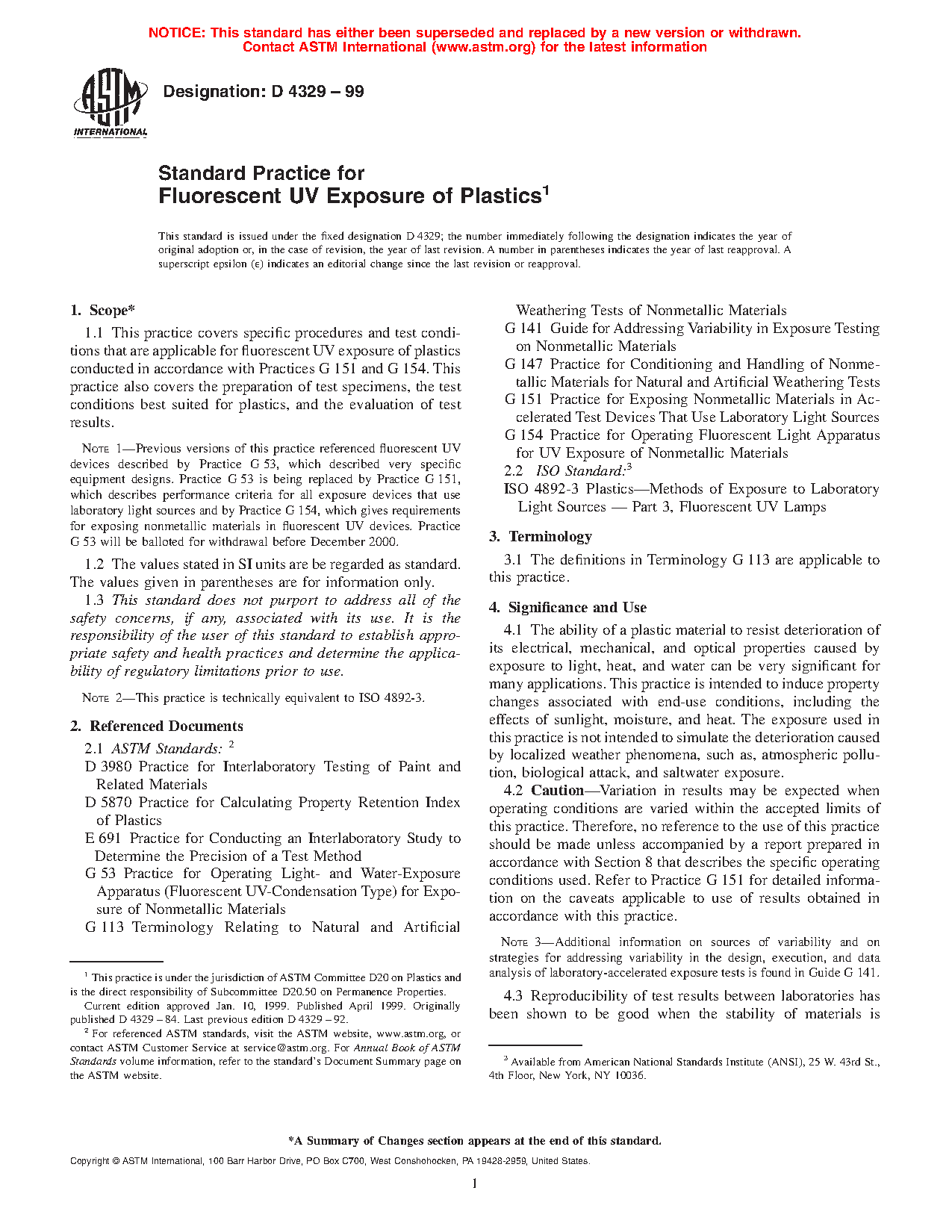 4.1 The ability of a plastic material to resist deterioration caused by exposure to light, heat, and water is a property of significance in many applications. This practice is intended to induce property changes associated with end-use conditions, including the effects of ultraviolet solar irradiance, moisture, and heat. The exposure used in this practice is not intended to simulate the deterioration caused by localized weather phenomena, such as, atmospheric pollution, biological attack, and saltwater exposure. (Warning—Variation in operating conditions within the accepted limits of this practice will not necessarily provide the same results. Therefore, no reference to the use of this practice shall be made unless accompanied by a report prepared in accordance with Section 8 that describes the specific operating conditions used. Refer to Practice G151 for detailed information on the caveats applicable to use of results obtained in accordance with this practice.)
