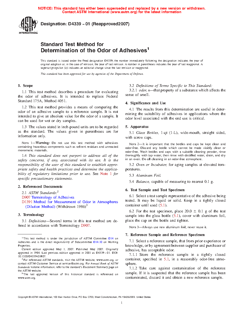 1.1 This test method describes a procedure for evaluating the odor of adhesives. It is intended to replace Federal Standard 175A, Method 4051.
