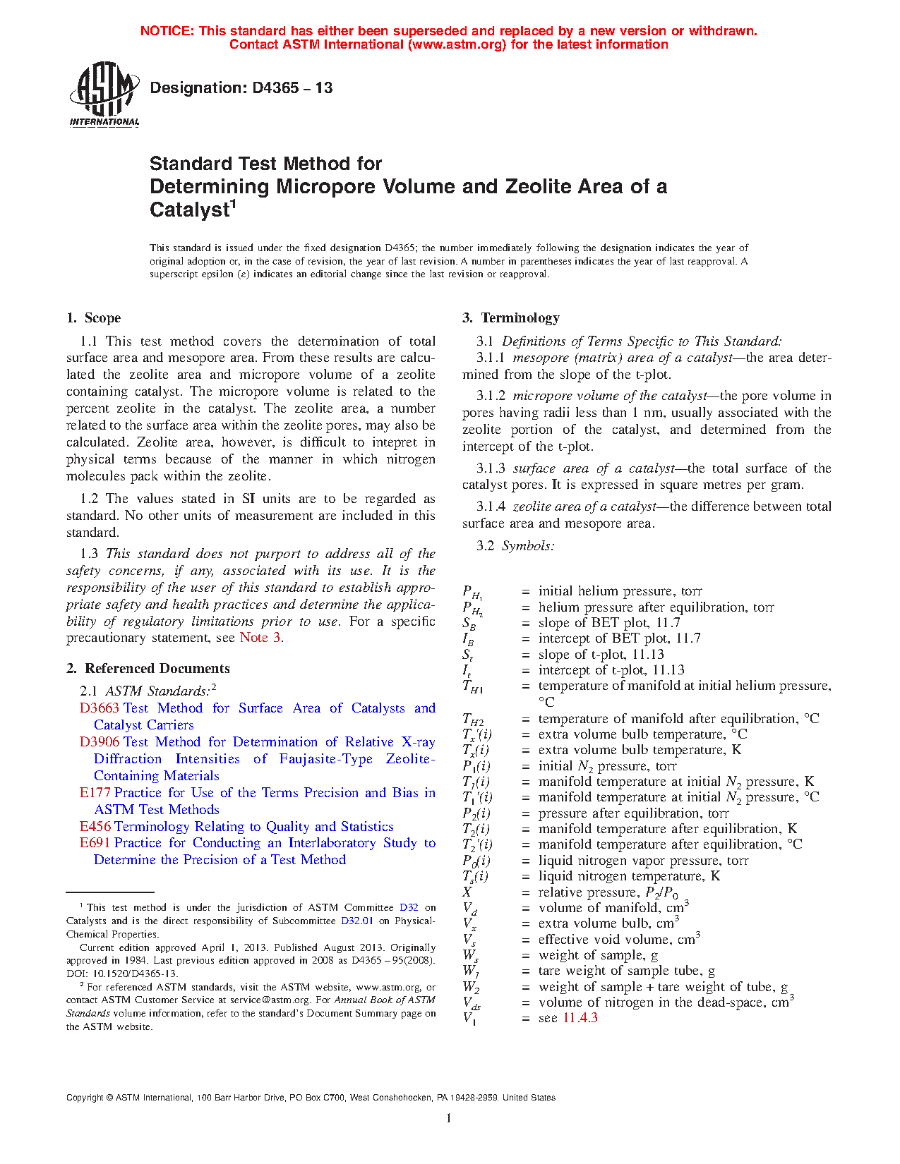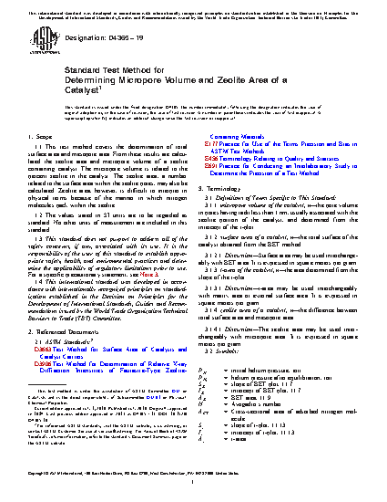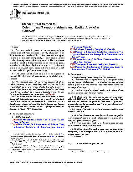 1.1 This test method covers the determination of total surface area and mesopore area. From these results are calculated the zeolite area and micropore volume of a zeolite containing catalyst. The micropore volume is related to the percent zeolite in the catalyst. The zeolite area, a number related to the surface area within the zeolite pores, may also be calculated. Zeolite area, however, is difficult to intepret in physical terms because of the manner in which nitrogen molecules pack within the zeolite.