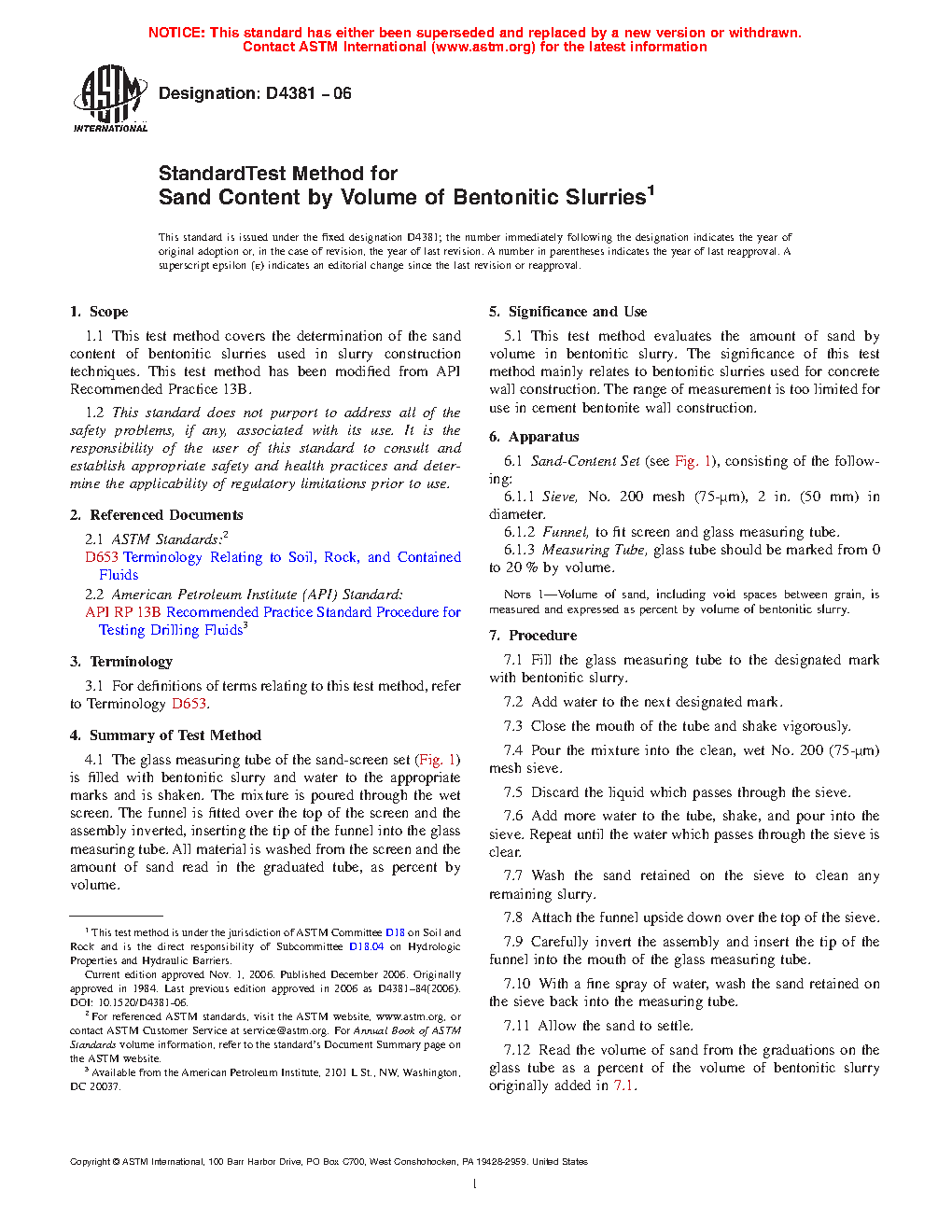 1.1 This test method covers the determination of the sand content of bentonitic slurries used in slurry construction techniques. This test method has been modified from API Recommended Practice 13B.