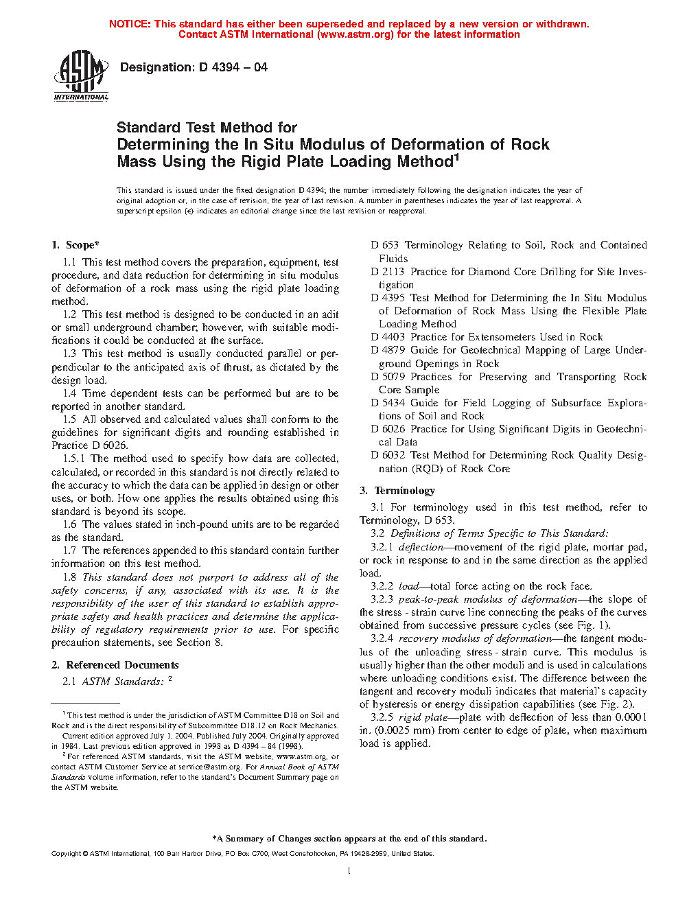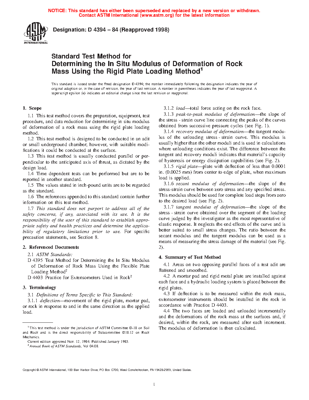 1.1 This test method covers the preparation, equipment, test procedure, and data reduction for determining in situ modulus of deformation of a rock mass using the rigid plate loading method.