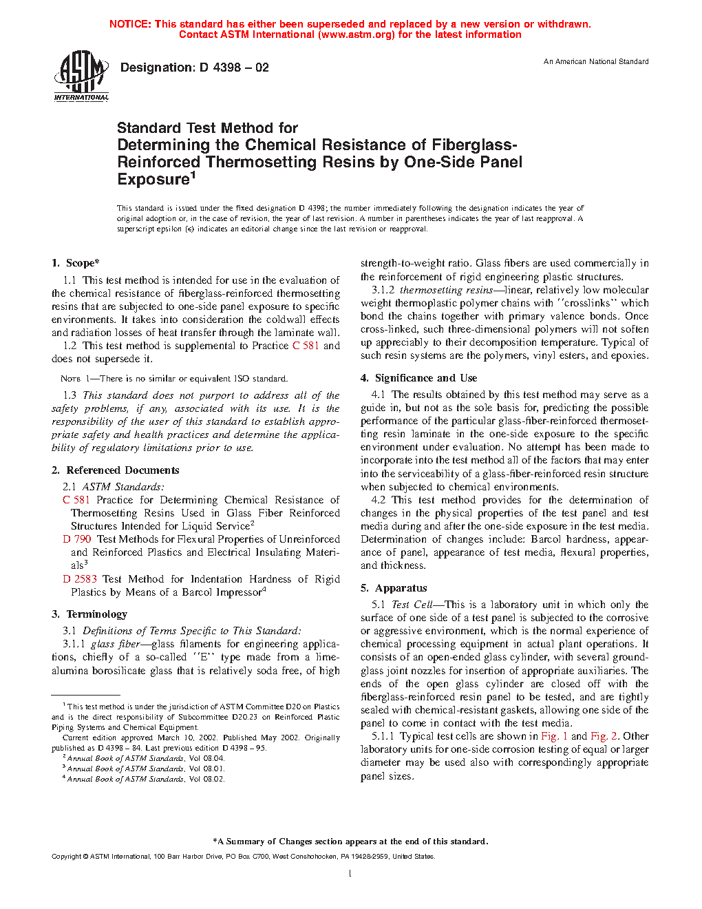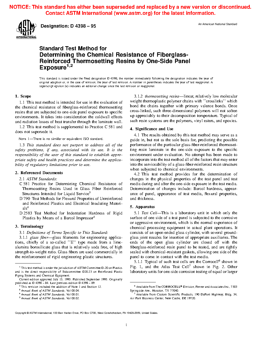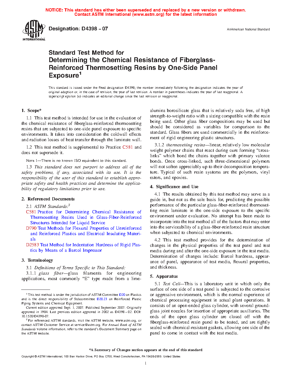 Standard Test Method for Determining the Chemical Resistance of Fiberglass-Reinforced Thermosetting Resins by One-Side Panel Exposure