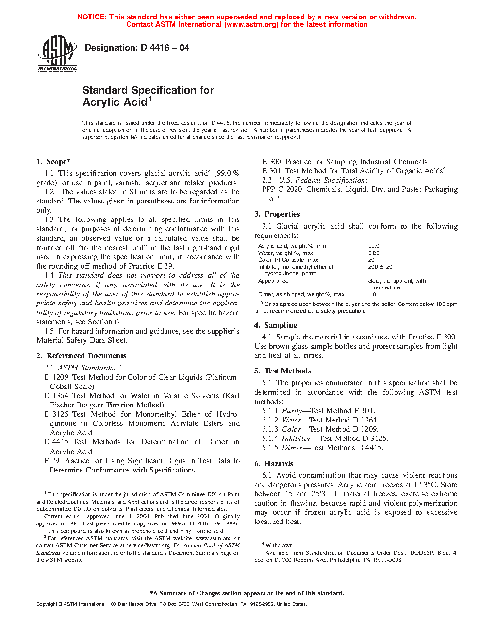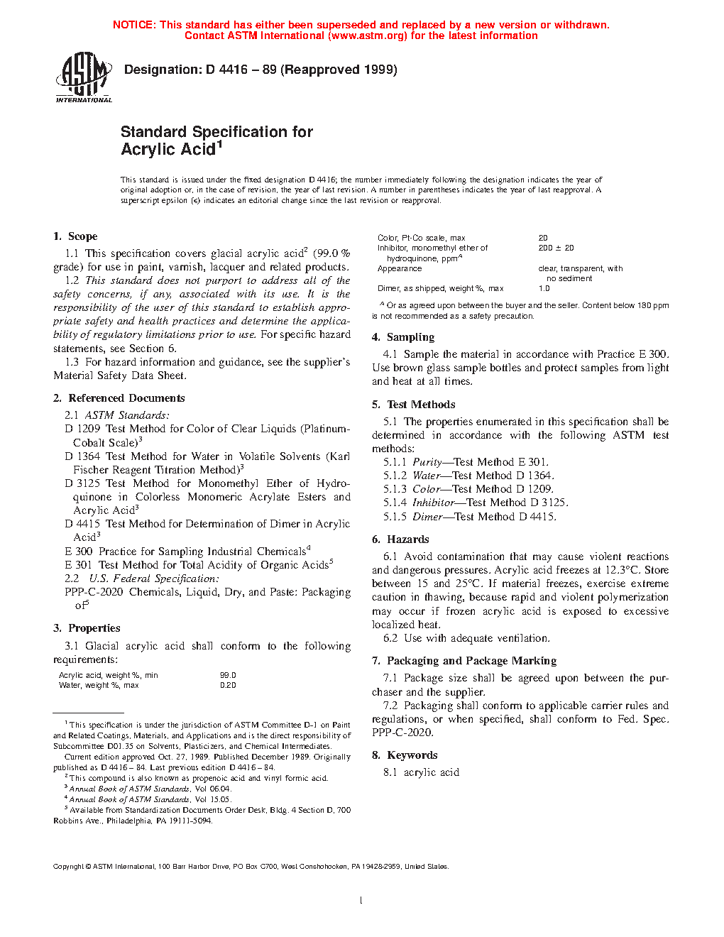 This specification covers glacial acrylic acid (99.0% grade) for use in paint, varnish, lacquer and related products. The properties of the material shall be determined in accordance with the following test methods: purity; water; color; inhibitor; and dimer.