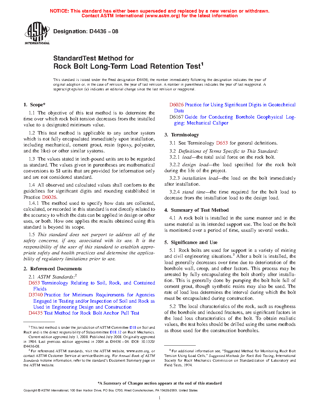 5.1 Rock bolts are used for support in a variety of mining and civil engineering situations.3 After a bolt is installed, the load generally decreases over time due to deterioration of the borehole wall, creep, and other factors. This process may be arrested by fully encapsulating the bolt shortly after installation. This encapsulation is generally done by pumping the bolt hole full of cement grout, though synthetic resins may also be used. The rate of load loss determines the interval during which the bolt must be encapsulated during construction.