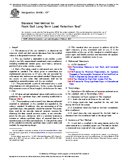 1.1 The objective of this test method is to determine the time over which rock bolt tension decreases from the installed value to a designated minimum value.
