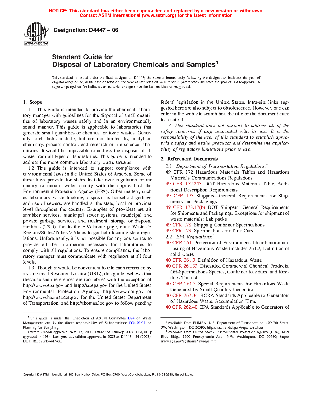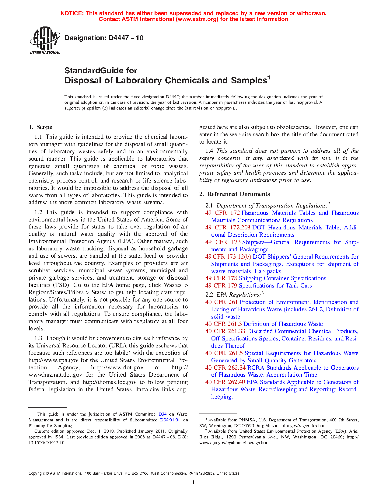 1.1 This guide is intended to provide the chemical laboratory manager with guidelines for the disposal of small quantities of laboratory wastes safely and in an environmentally sound manner. This guide is applicable to laboratories that generate small quantities of chemical or toxic wastes. Generally, such tasks include, but are not limited to, analytical chemistry, process control, and research or life science laboratories. It would be impossible to address the disposal of all waste from all types of laboratories. This guide is intended to address the more common laboratory waste streams.
