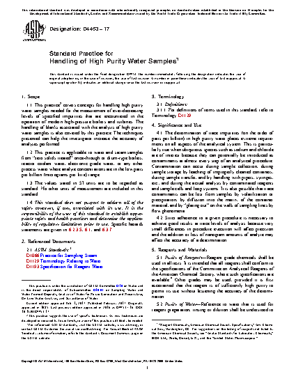 1.1 This practice2 covers concepts for handling high purity water samples needed for the measurement of ever-decreasing levels of specified impurities that are encountered in the operation of modern high-pressure boilers and turbines. The handling of blanks associated with the analysis of high purity water samples is also covered by this practice. The techniques presented can help the investigator increase the accuracy of analyses performed.