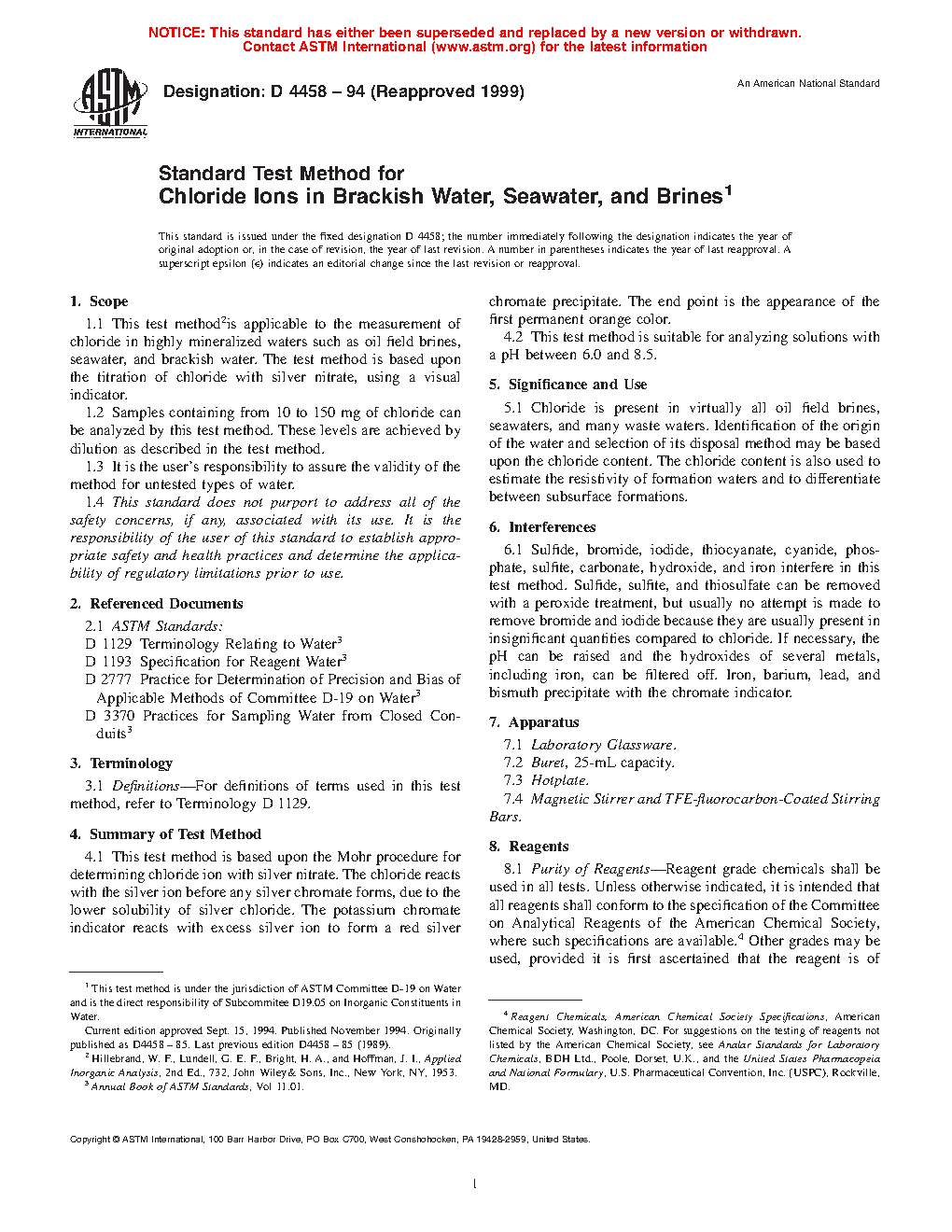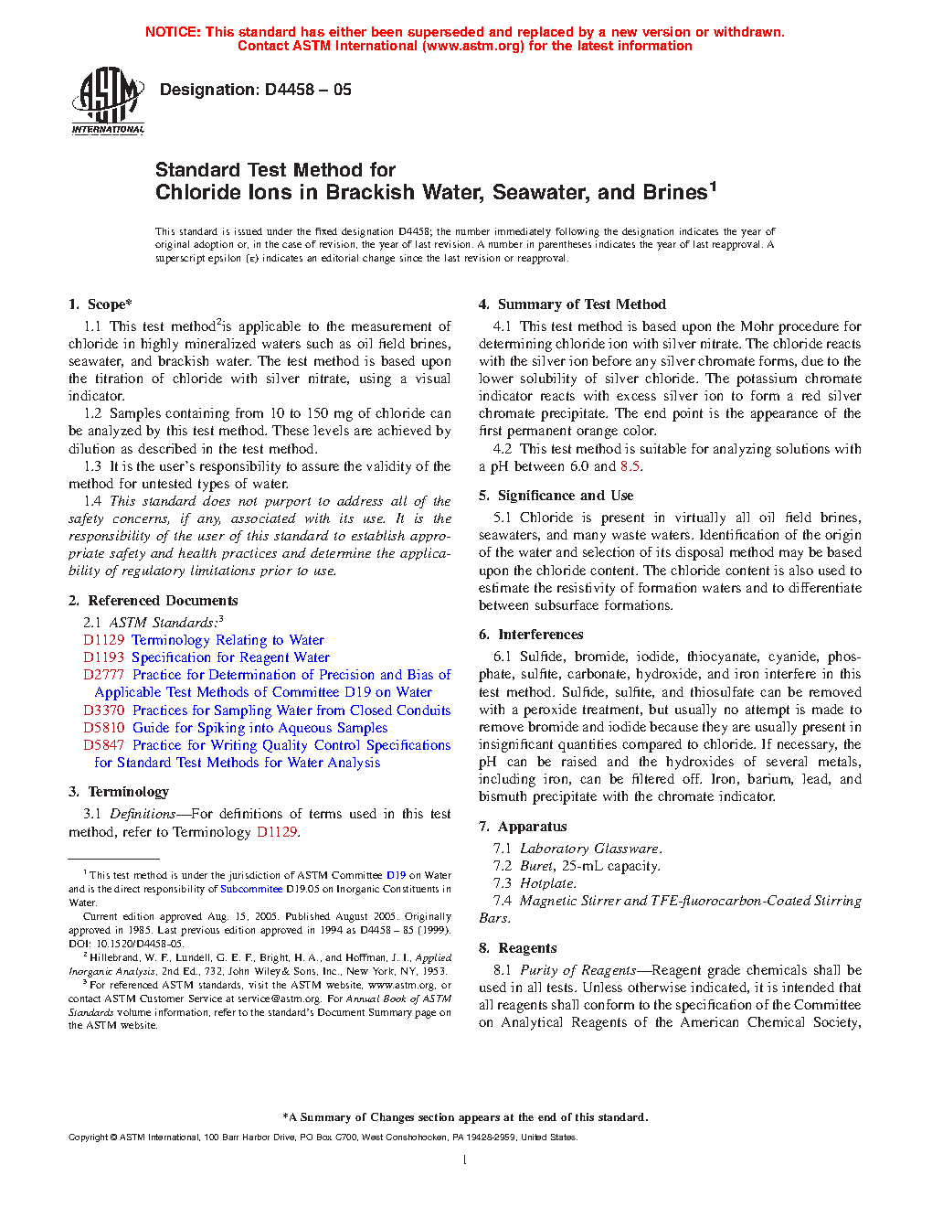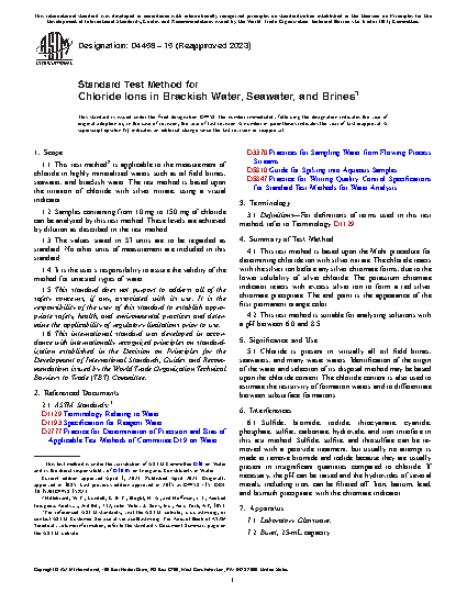 1.1 This test method2 is applicable to the measurement of chloride in highly mineralized waters such as oil field brines, seawater, and brackish water. The test method is based upon the titration of chloride with silver nitrate, using a visual indicator.
