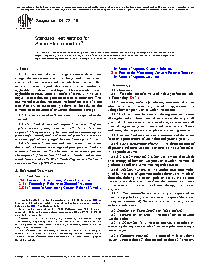 1.1 This test method covers the generation of electrostatic charge, the measurement of this charge and its associated electric field, and the test conditions which must be controlled in order to obtain reproducible results. This test method is applicable to both solids and liquids. This test method is not applicable to gases, since a transfer of a gas with no solid impurities in it does not generate an electrostatic charge. This test method also does not cover the beneficial uses of static electrification, its associated problems or hazards, or the elimination or reduction of unwanted electrostatic charge.2