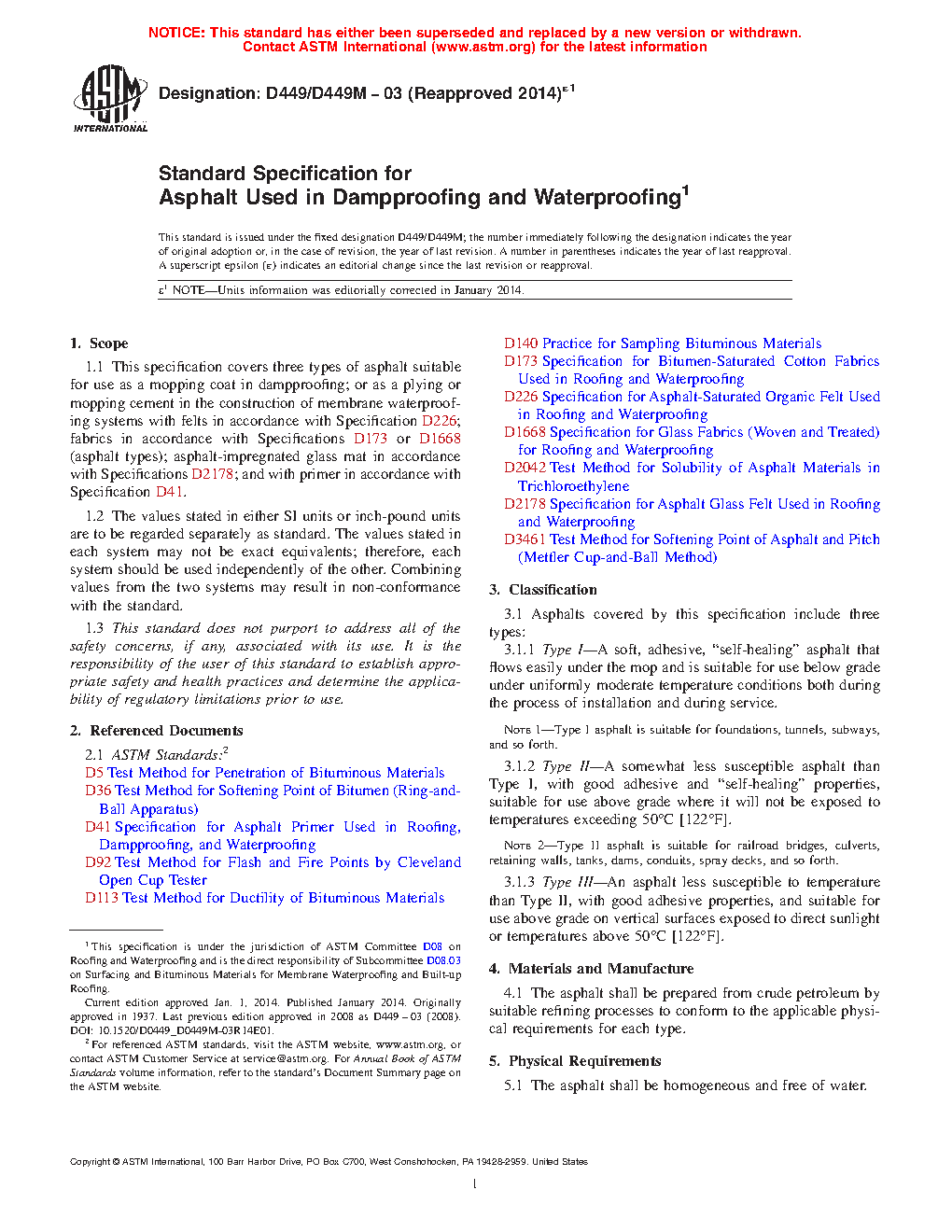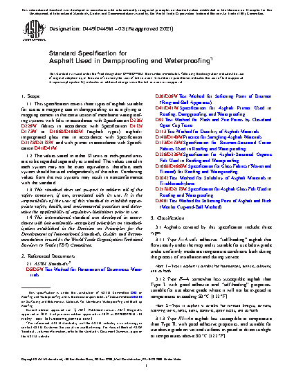 1.1 This specification covers three types of asphalt suitable for use as a mopping coat in dampproofing; or as a plying or mopping cement in the construction of membrane waterproofing systems with felts in accordance with Specification D226/D226M; fabrics in accordance with Specification D173/D173M or D1668/D1668M (asphalt types); asphalt-impregnated glass mat in accordance with Specification D2178/D2178M; and with primer in accordance with Specification D41/D41M.