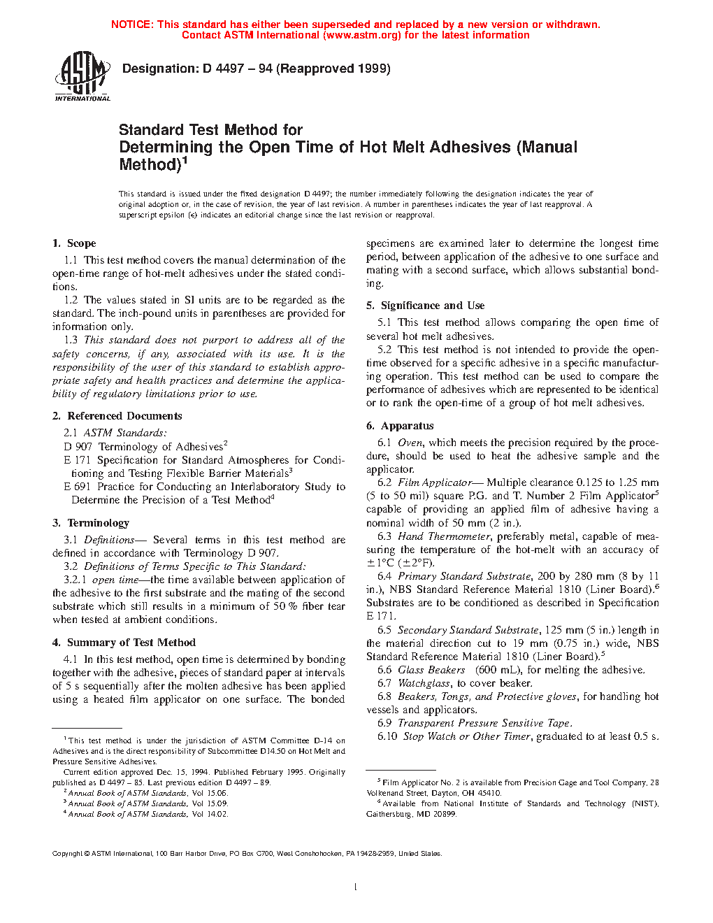 This test method is not intended to provide the open-time observed for a specific adhesive in a specific manufacturing operation. This test method can be used to compare the performance of adhesives which are represented to be identical or to rank the open-time of a group of hot melt adhesives.