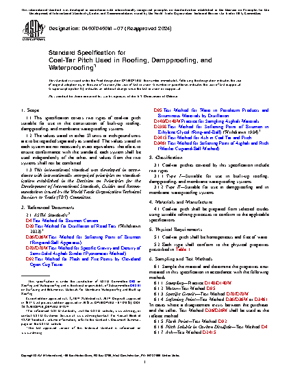 This specification covers the testing and physical requirements of two types of coal-tar pitch suitable for use in the construction of built-up roofing, dampproofing, and membrane waterproofing systems. The coal-tar pitch shall be prepared from selected crudes using suitable refining processes, and shall be homogeneous and free of water. Materials shall be sampled, tested, and conform to properties such as water content, specific gravity, ring-and-ball softening point, Cleveland open cup flash point, solubility in carbon disulfide, ash content, and distillation (total distillates and residue).