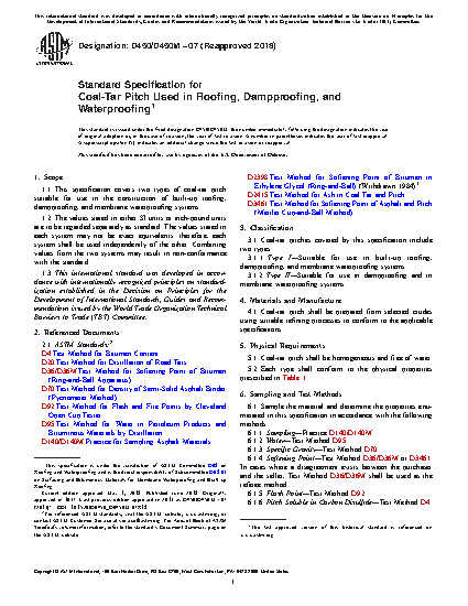 1.1 This specification covers two types of coal-tar pitch suitable for use in the construction of built-up roofing, dampproofing, and membrane waterproofing systems.