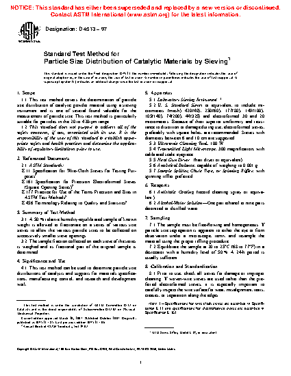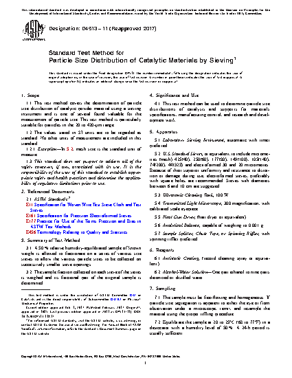 1.1 This test method covers the determination of particle size distribution of catalytic powder material using a sieving instrument and is one of several found valuable for the measurement of particle size. This test method is particularly suitable for particles in the 20 to 420 µm range. (See Terminology D3766.)